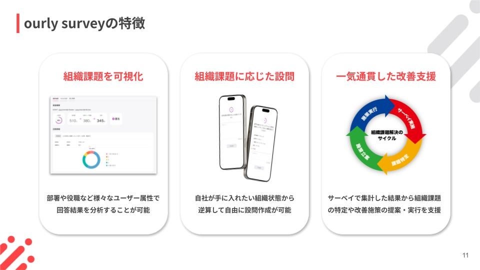 そのような背景から当社では、これまでに200社以上の組織課題の解決から得られたメソッドをもとに、従来のエンゲージメントサーベイとは異なるサーベイ「ourly survey」を開発いたしました。