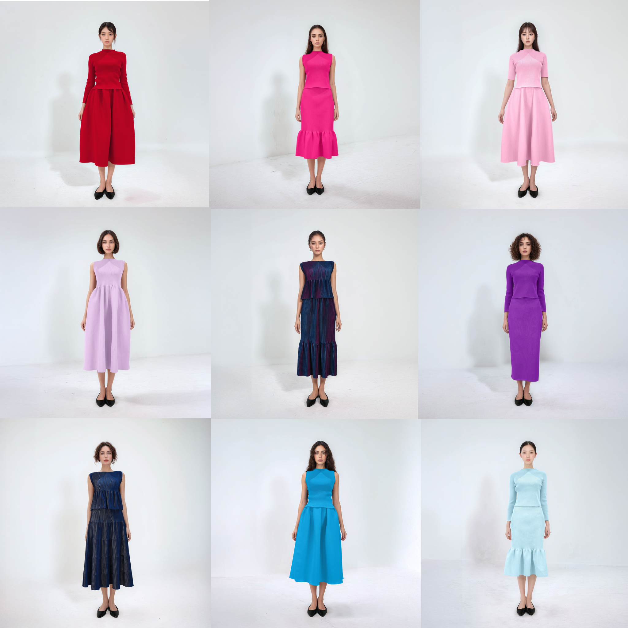 単色のホールガーメントシリーズを中心に、3Dプリーツ(3色の糸を使い角度で色が変わる)シリーズの人気カラー4色を合わせて構成しました。