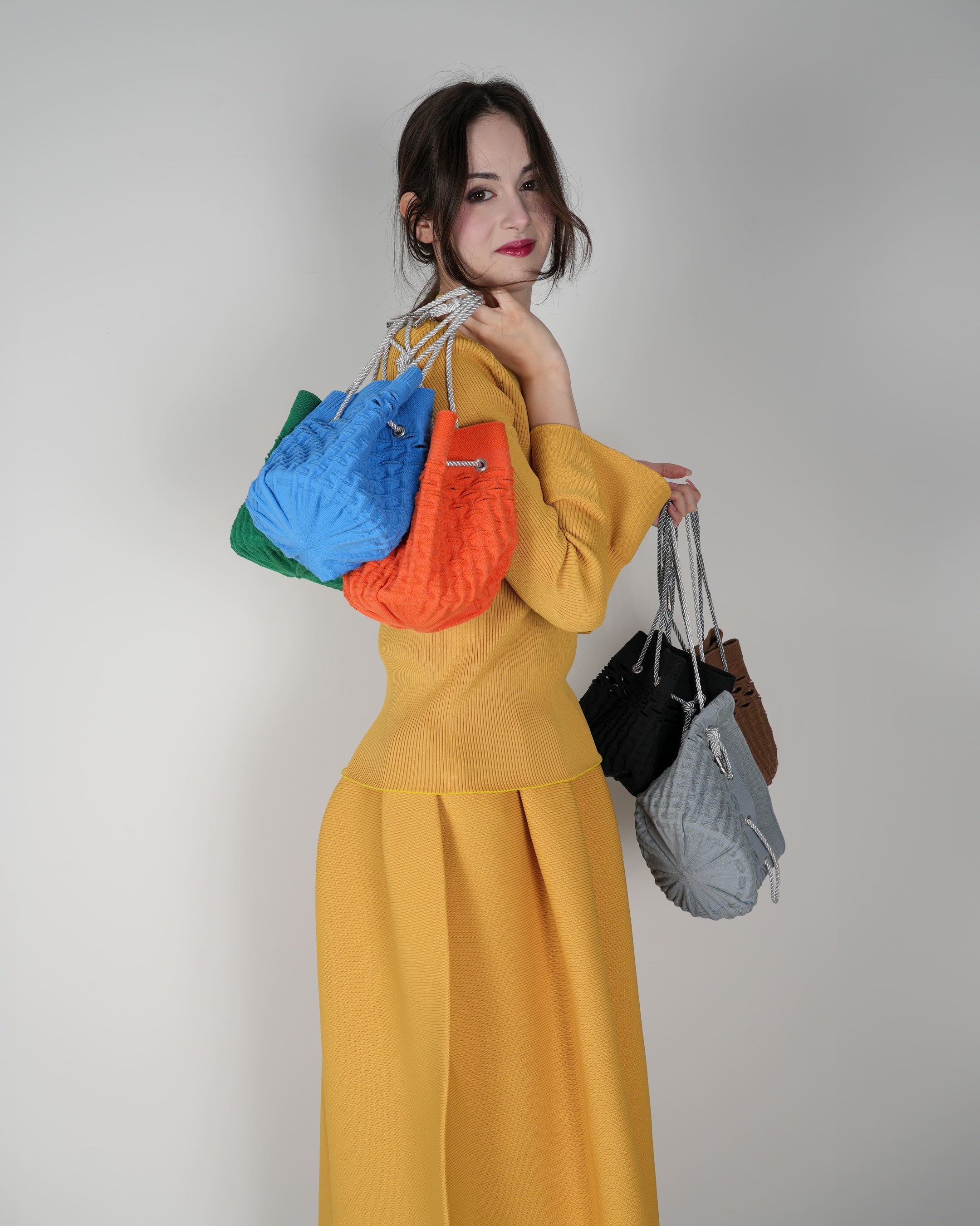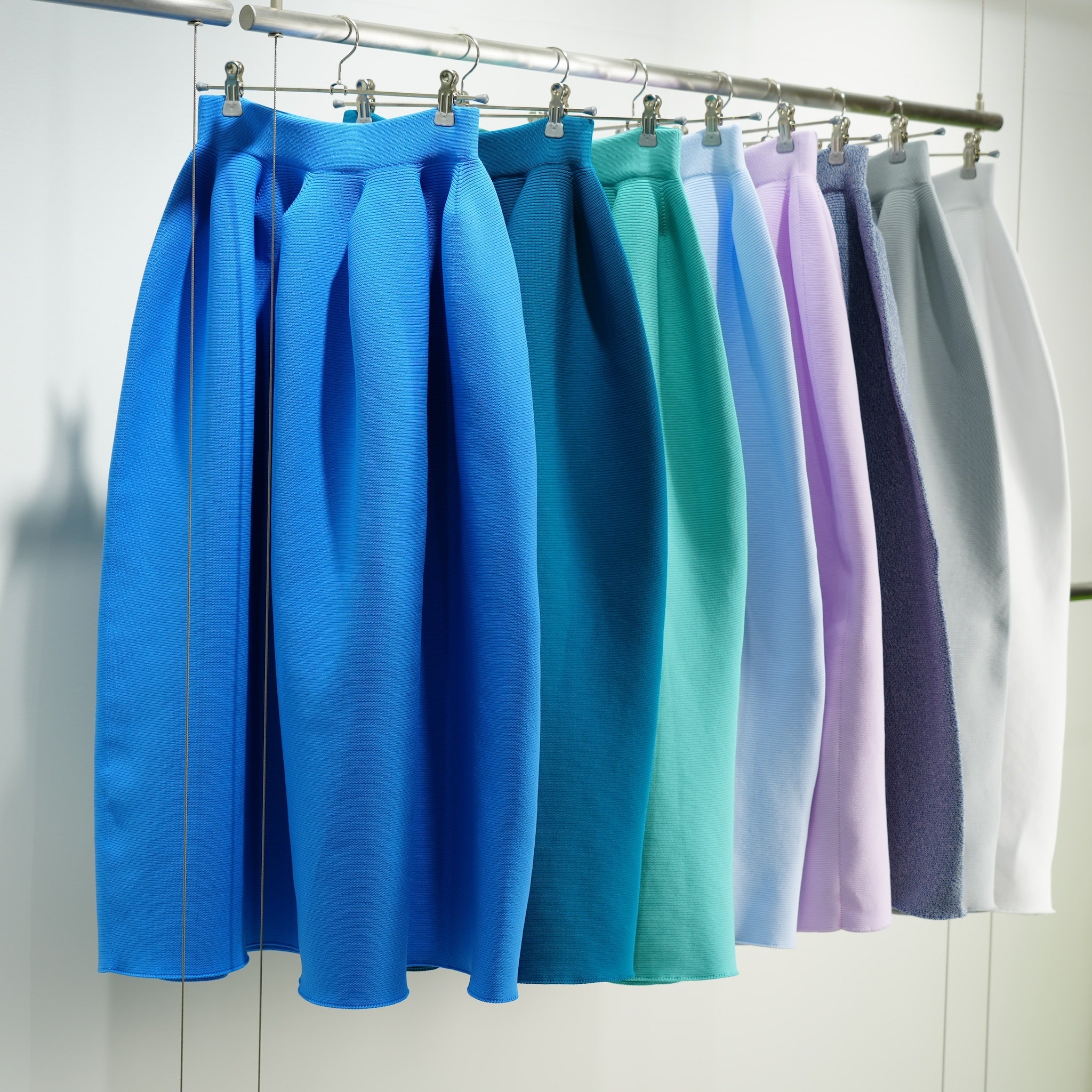 3Dデザインのホールガーメントの特徴である立体感を活かし、ニットのセットアップ「ニットアップ」を中心に据えました。スカートとトップスをそれぞれ複数型展開することで、組み合わせによって全く違う表現を楽しめるようになっています。