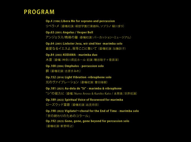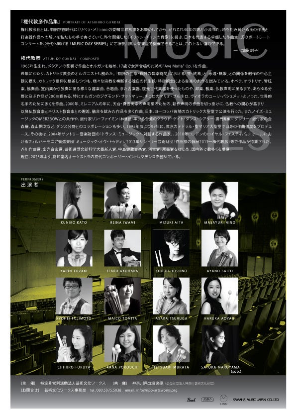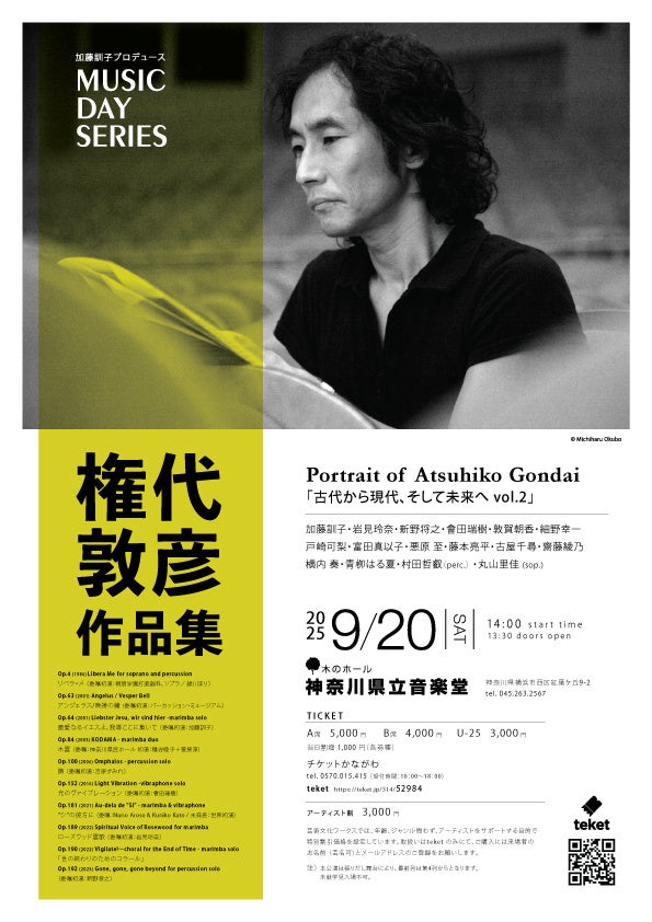権代敦彦氏とは1986年、桐朋学園時代に《リベラ・メ》を委嘱初演して以来、かれこれ40年の歳月が流れつつある。時の流れの中で、権代敦彦氏は一貫して、時代の呼吸と響き合いながら、独自の作法をもって創作を重ねている。その歩みの中でも、打楽器という領域に注がれた情熱と探究は、私たち演奏家にとって常に大いなる挑戦であり、また歓びでもある。日本を代表する現代作曲家の一人である権代敦彦氏のポートレート・コンサートを、「MUSIC DAY SERIES」として、歴史ある神奈川県立音楽堂にて開催できることは、この上なく光栄であり、次代へと繋ぐ音楽の贈りものとなることを期待する。