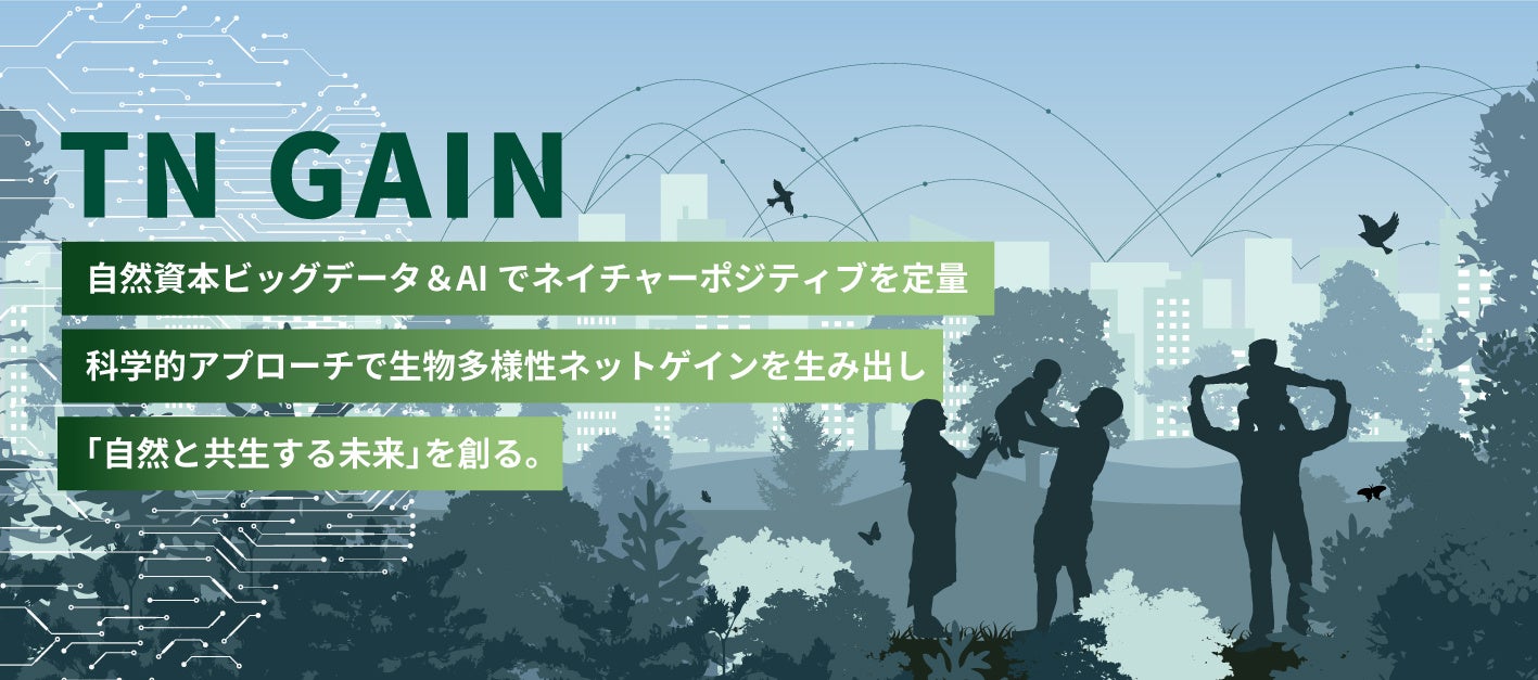 このような、ネイチャー関連のデータテクノロジーを基に実装された「TN GAIN」は、企業や自治体などが行う保全・再生事業を支援するサービスで、「生物多様性の純増」以下「生物多様性ネットゲイン」を定量します。