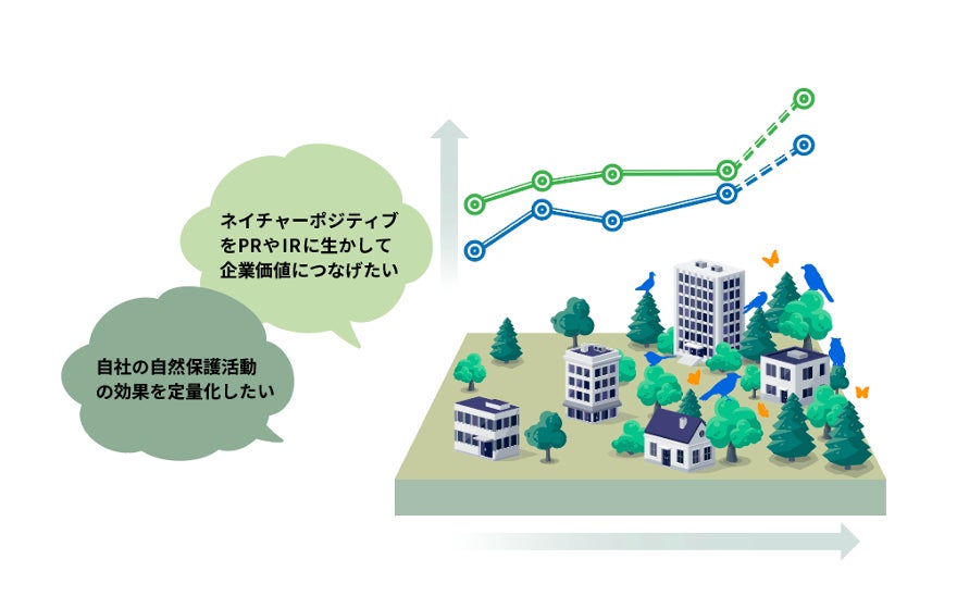 住宅の庭づくり、都市再開発における不動産物件の緑化計画 、企業緑地や社有林における森づくり、ビオトープの計画など、ネイチャーポジティブ関連事業の効果量をビフォー・アフターの比較を基に算定し、生物多様性ネットゲインを可視化します。