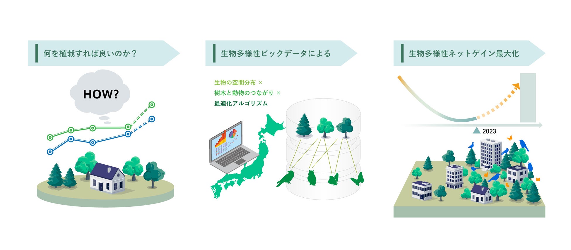 さらに、データに基づいたシナリオ分析を行い、生物多様性ネットゲインの費用対効果の算定、および、ネットゲインを最大化する事業計画を提案します。例えば、不動産開発のロケーションに応じて、様々な生き物の生息環境や共生関係を再生するための植栽樹種・本数の最適組み合わせ等を計算します。様々なシミュレーションを行い、従来的な事業(成り行きシナリオ)、他社と差別化した事業(自社シナリオ)を行った場合などを比較し、ベストプラクティスなネイチャーポジティブ事業を、科学的にデザインできます。