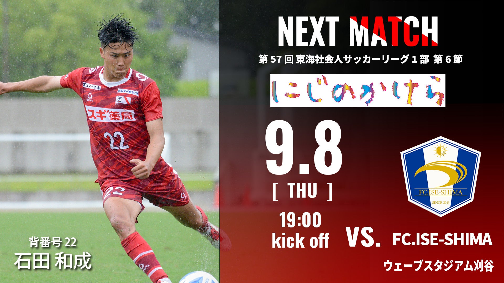 9月8日(木)第57回東海社会人サッカーリーグ1部 第6節にじのかけらPresentsFC.ISE-SHIMA戦の試合情報をお知らせいたします。
