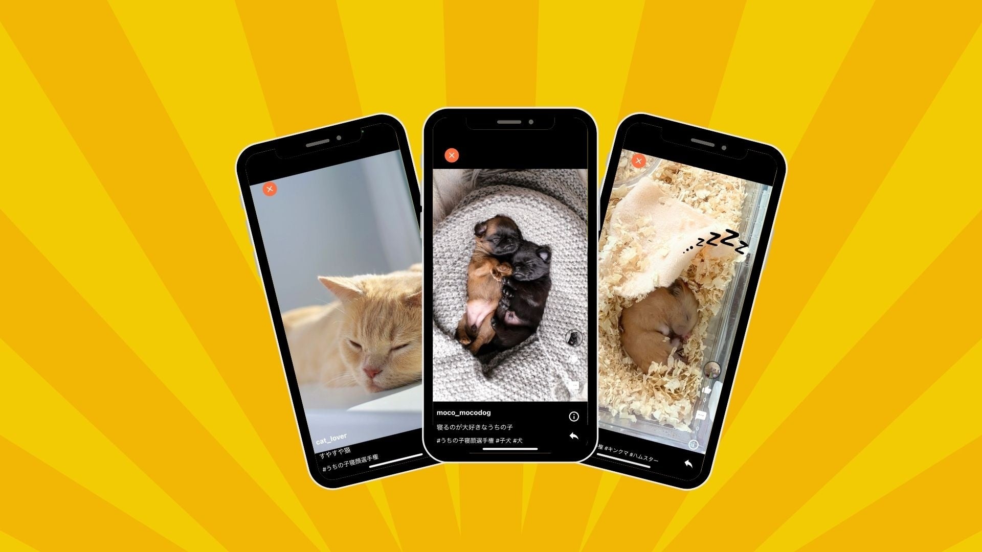 #うちの子寝顔選手権 のハッシュタグをつけた動画をアプリ内で投稿していただき、優秀賞に選ばれた動画を、7月1日(土)〜7月31日(月)までの1ヶ月間、渋谷愛ビジョンにて放映させていただきます。(※期間は多少前後する可能性あり)