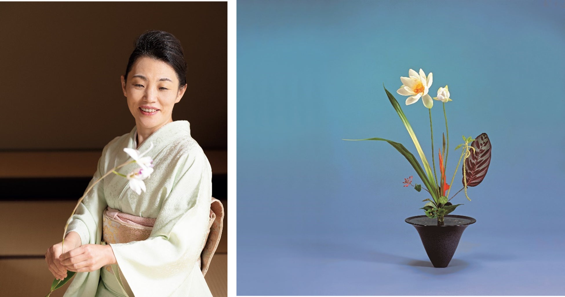戦後、海外にも広がりはじめた「いけばな」は、アメリカ、ヨーロッパ、アジア、アフリカへと広がりをみせ、現在、池坊の海外支部は120支部を数えます。また、広島サミットのG7首脳会議の会場での大作展示や、日本ASEAN友好協力50周年特別首脳会議の会場ラウンジに華道家元池坊がいけばなの装花を行うなど、国外にも日本の美しい「いけばな」を伝え続けています。560年以上もの歴史をもつ池坊で女性として初めて華道家元池坊を継ぐ次期家元の池坊 専好氏は、いけばなの歴史と伝統を紡いで来られた先人たちの思いと共に、今を生き、未来を創り続けています。