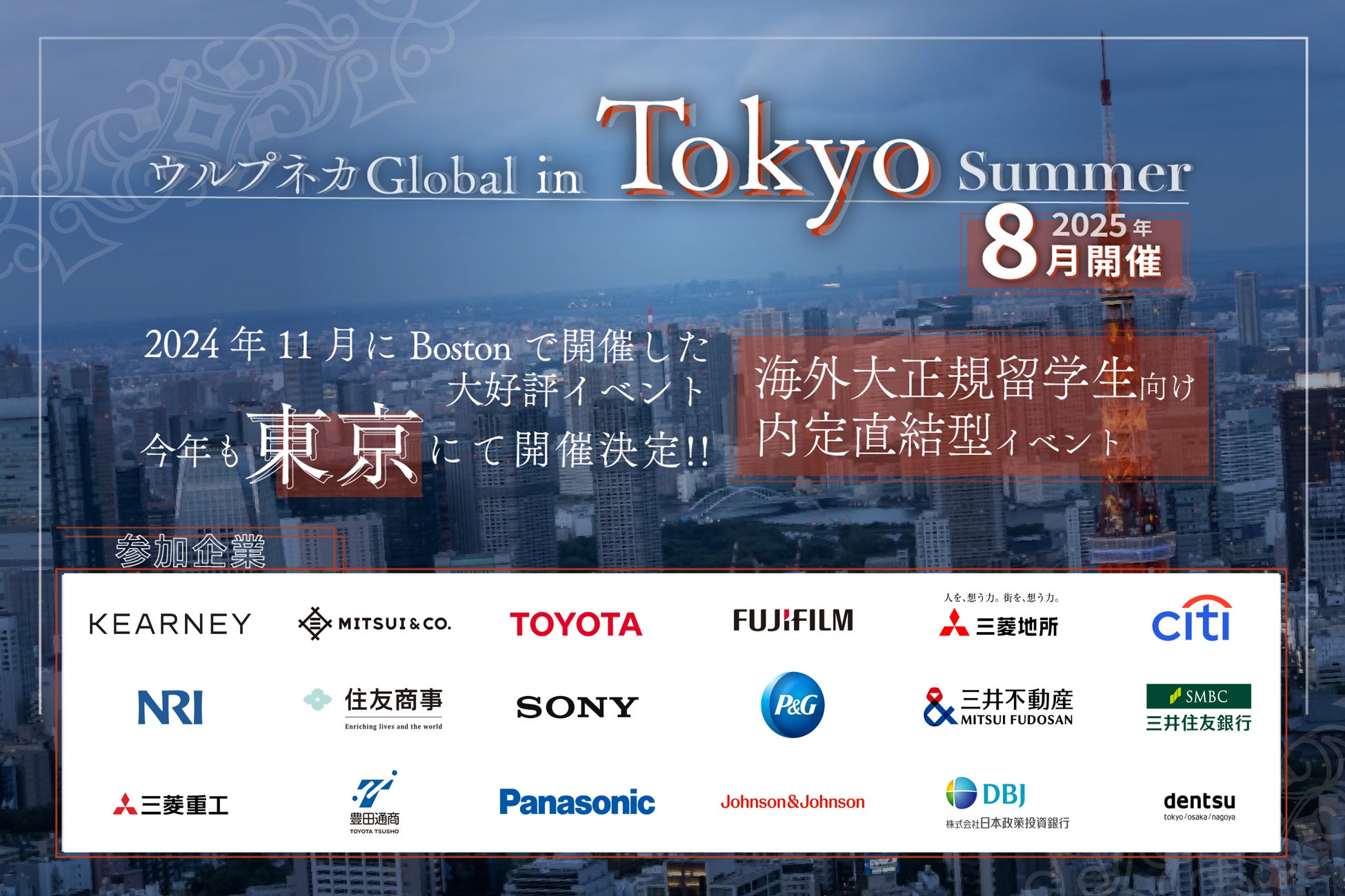 海外大 正規留学生(日本人)向け 就活イベント「ウルプネカ Global in Tokyo Summer 2025」が8月に開催決定!海外大に通う日本人と豪華企業が大集結!