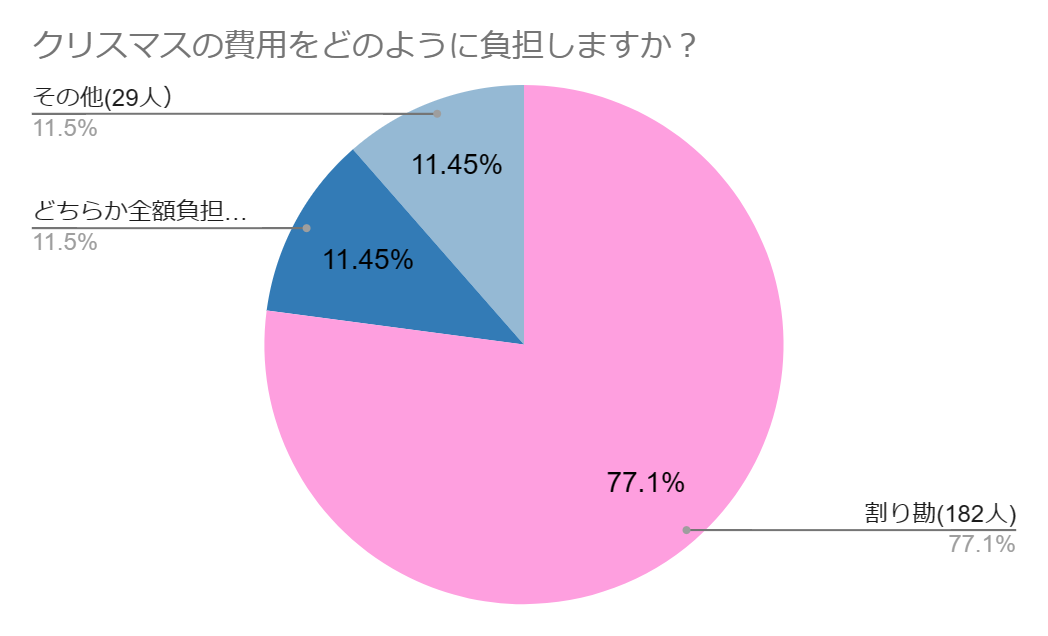 「クリスマスの予算は割り勘ですか、それともどちらかが全額負担ですか。」という質問では全体の77.1%が「割り勘」と回答しました。また、全体の11.4%が「全額負担」と回答しました。一方で、「彼氏が多めに払う」という回答もあり、女性より男性が多くお金を払う傾向がみられました。