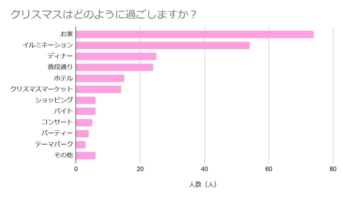 新型コロナウイルス感染症の流行が収まり、クリスマス当日の外出を考えている人も多くいることが分かります。その一方でクリスマス当日を家や学校で過ごす人や、予算をかけずに過ごす人も多く、調査対象が学生ならではの回答が得られました。