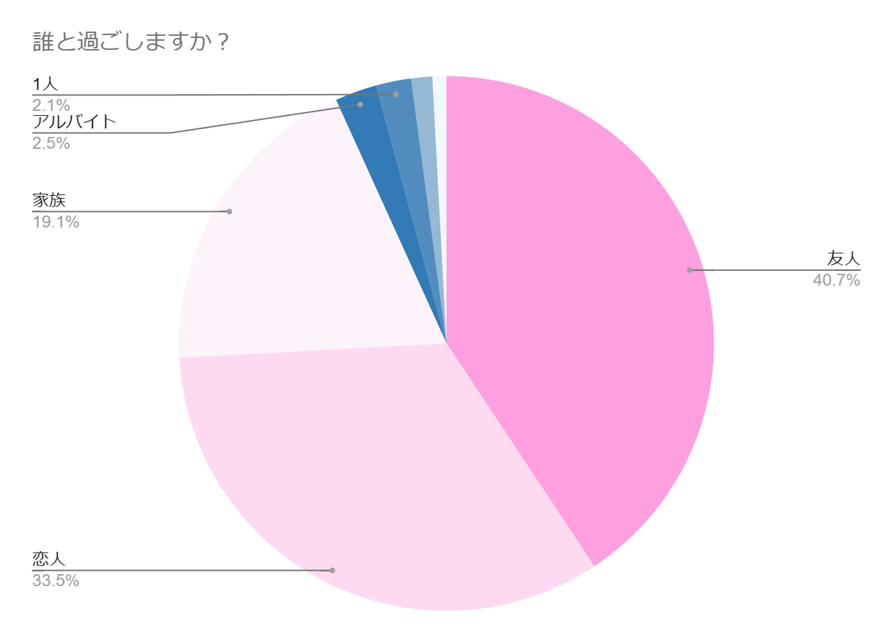 「クリスマスは誰と過ごしますか」という質問に対し、「友人」と回答した方は40.7%、一方で「恋人」と回答した方は全体の33.5%となり、恋人より友人と過ごす方が多いという結果になりました。高校生、大学生の19.1%が家族と過ごすと回答したことは予想外でした。