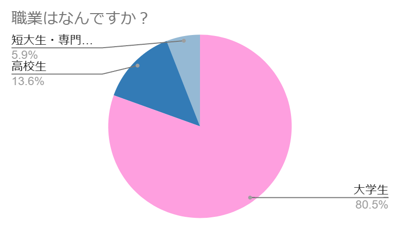 大学生が80.5%、高校生が13.6%、短大生・専門生が5.9%となっている。