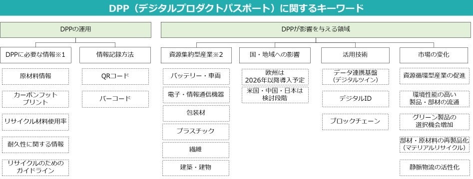 デジタルプロダクトパスポート(Digital Product Passport(以下、DPP))は、原材料調達からリサイクルに至るまでの製品のライフサイクル全体にアクセスできる電子的な記録であり、サーキュラーエコノミーを推進するための施策となります。DPPにより、各製品のリサイクル率の向上など、環境への効果が見込まれる一方で、DPP未対応の製品が市場から締め出される懸念もあることから、製造業を中心とした民間企業各社では、自社の製品戦略やサプライチェーンへの影響を把握する必要があります。