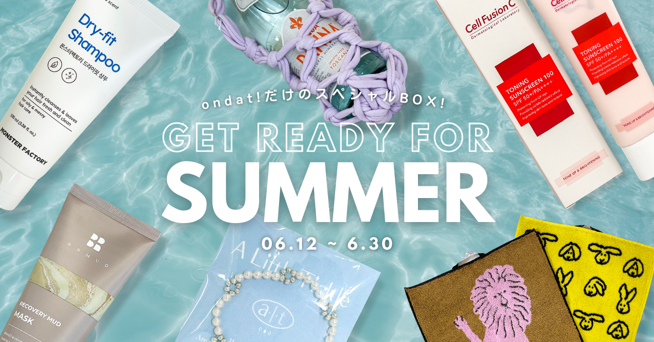 GET READY FOR SUMMER BOXでは、夏の準備をテーマにK-POPアイドルが愛用する『タンブラーバッグ』、大手ドラッグストアのランキング上位の『トーンアップサンクリーム』、飛行機にも持ち込める『ドライシャンプー』、韓国一の泥の産地”保寧"の泥をふんだんに使った『マッドマスク』、繊細で爽やかなカラーリングが可愛い『パールブレスレット』、日本でも人気なwarmgrey tailと74年伝統の韓国1位タオルブランド ソンウォルタオルのコラボ『ハンドタオル』、リユーザーブルに使える『ビニールバッグ』を1箱でご用意いたしました。