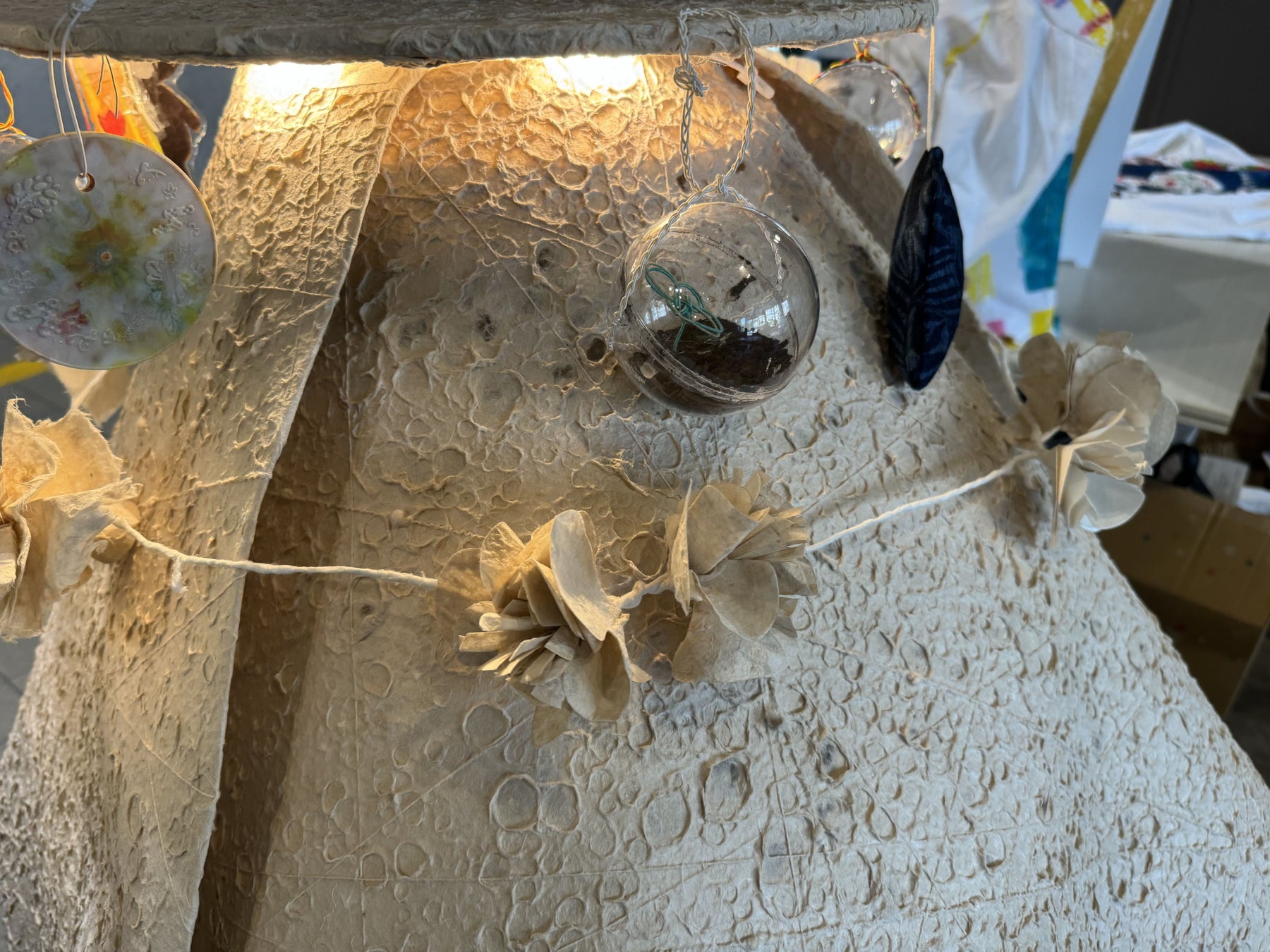 ツリーの高さは2~3メートル。幹は石垣島の廃棄漁網を使用し、枝葉の装飾には紙資源や間伐材をアップサイクルした和紙や、食品残渣で染色した”のこり染”の布地が用られています。