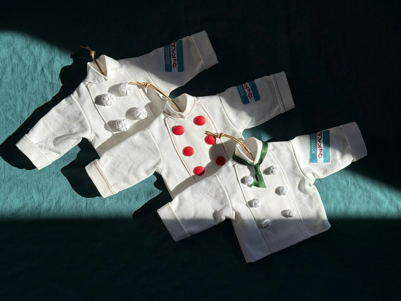 作品はそのまま展示したり、カットしてオーナメントを作製し、ツリーの装飾にしました。また、同じく廃棄予定のコックコートを使用し、社内でミニチュアのコックコートにアップサイクル。可愛らしいオーナメントに生まれ変わりました。