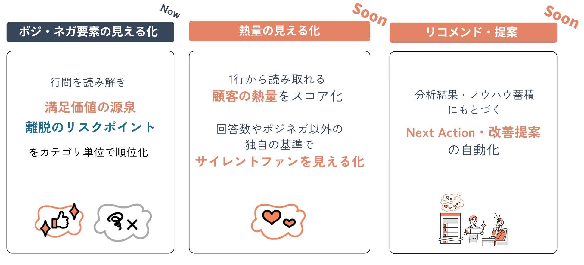 また、蓄積していくVOCデータ・分析結果をベースに、クライアント企業が目指すゴールや活用目的に沿って、Next Actionや改善提案を自動で行う仕組みの構築にも取り組んでいきます。