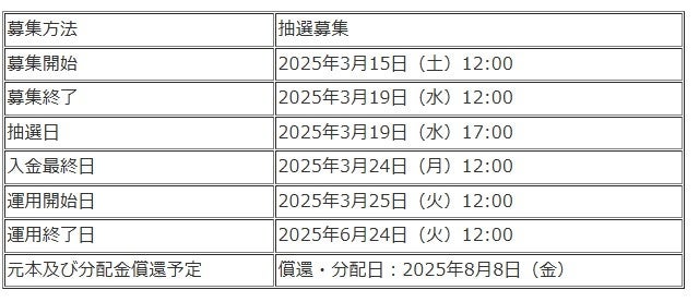 決済延期などの可能性も考慮し、ファンド組成時の運用終了予定日は2025年6月24日(運用期間3カ月)と設定しています。