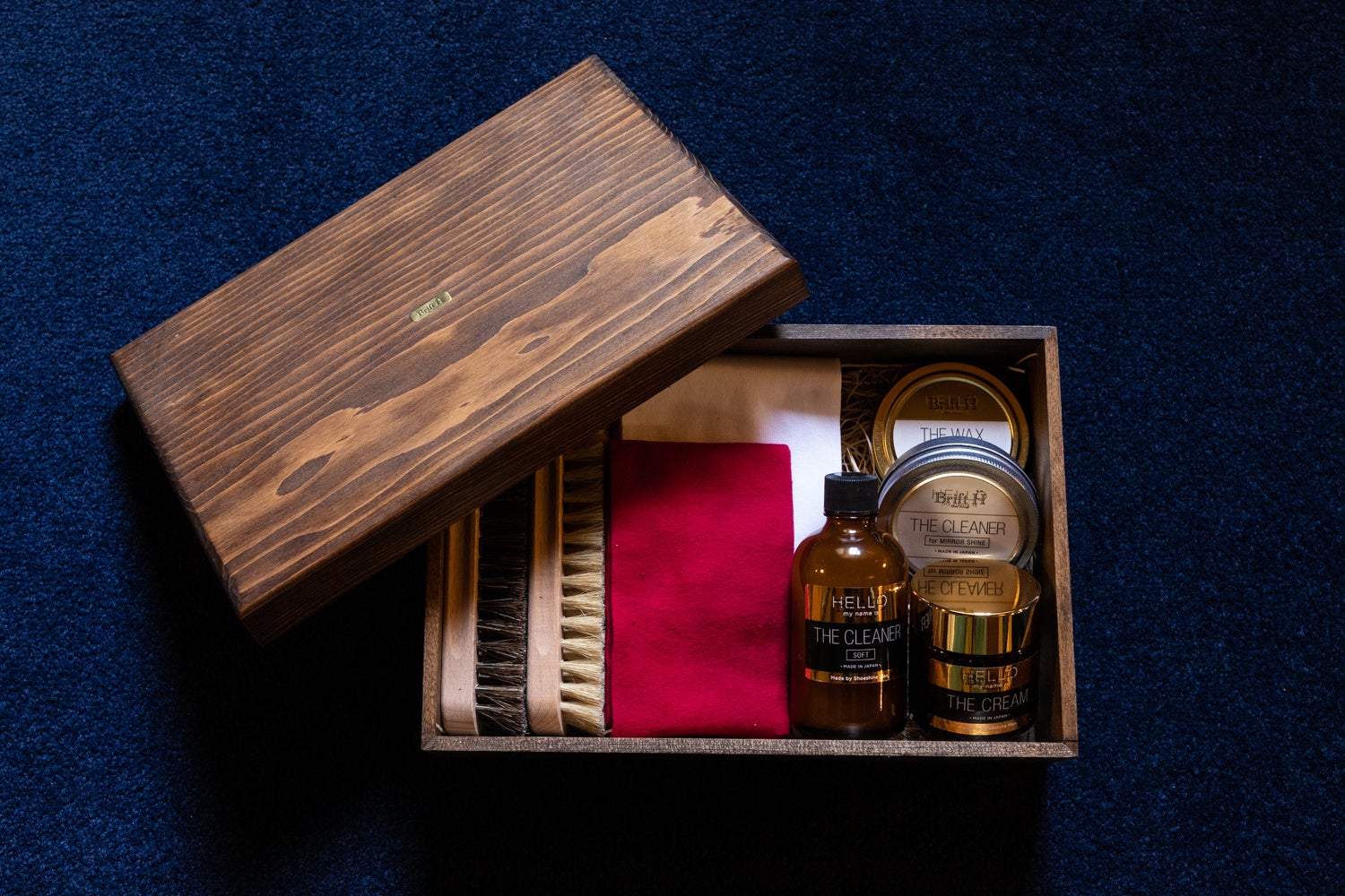 一つ一つ手作業で仕上げた木箱の中には靴磨きのフルコースが出来るフルセットが入っており、これさえあればプロ並みの靴磨きを実践できます。自分へのご褒美に、また大切な人へのプレゼントでも最適な逸品です。