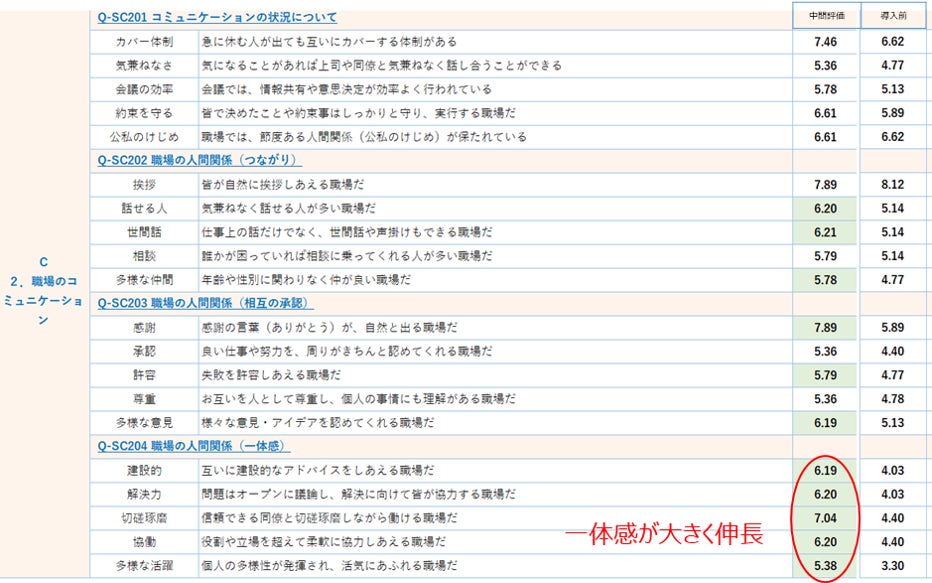 「仕事の裁量度」「フィードバック・達成感」でスコアが大幅に改善した。