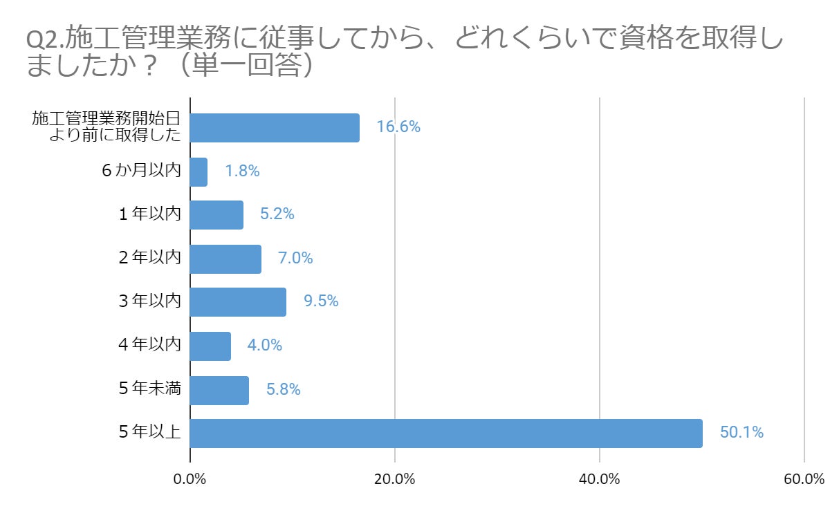 一方で、施工管理業務に従事してから1年以内で資格を取得した方も23.6%いました。