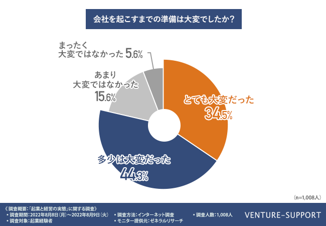 続いて、「会社を起こすまでの準備は大変でしたか?」と質問したところ、8割近くが大変だった(とても大変だった34.5%、多少は大変だった44.3%)と回答した。