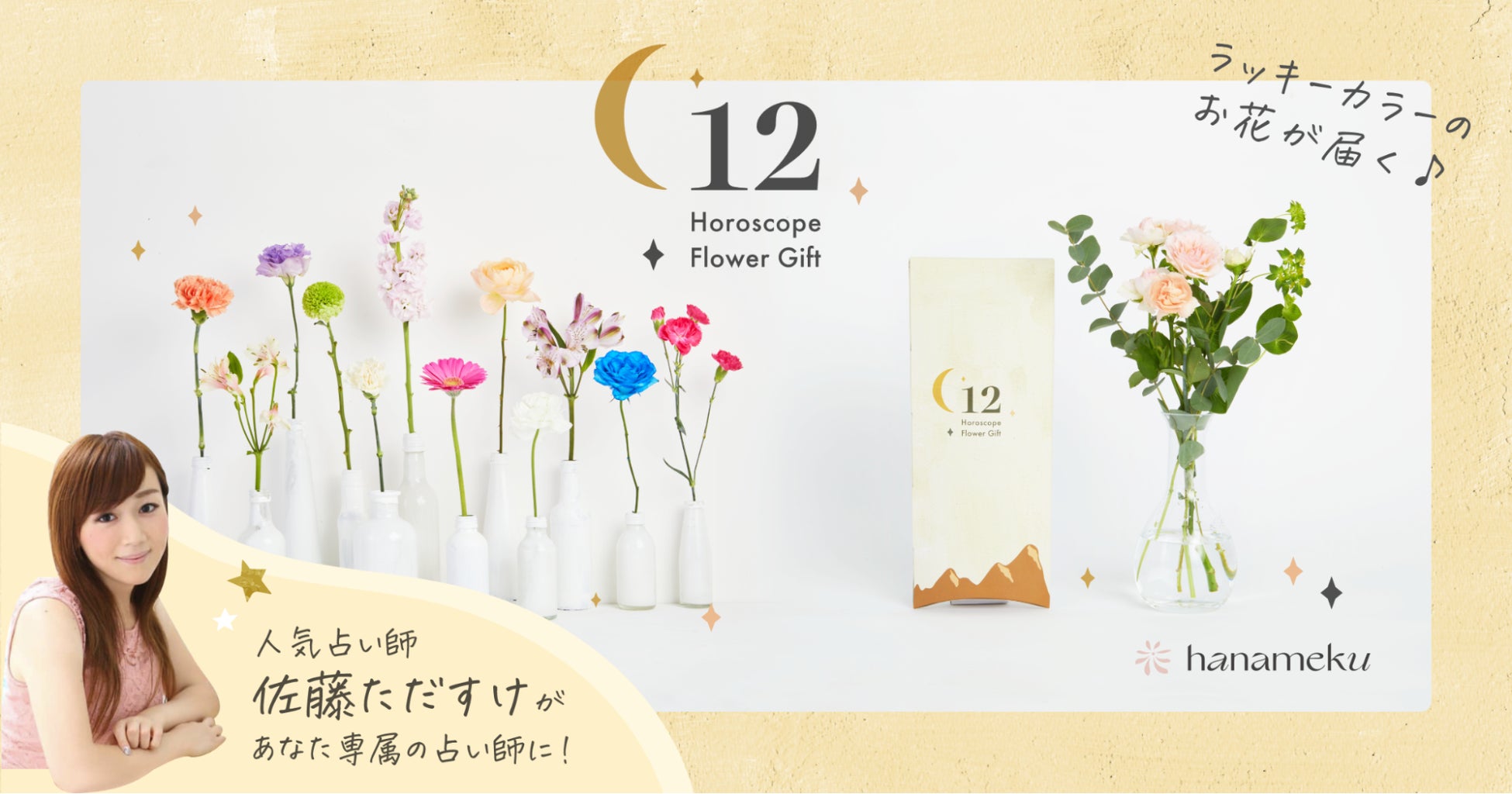 「ヒトそれぞれのライフスタイルに新しい価値をもたらすサービスをつくる」をミッションに、P2CやD2C事業、新規事業立ち上げ支援を行うdivi株式会社(本社:東京都港区、代表取締役社長:石井 裕)が運営する、暮らしに新鮮で旬な花のときめきを添え、心彩るひとときにする花の定期便「hanameku(ハナメク)」が予約の取れない人気占い師「佐藤ただすけ」とコラボを行い、2022年12月26日(月)より花の定期便プランとして「12Horoscope Flower Gift」を発売いたします。