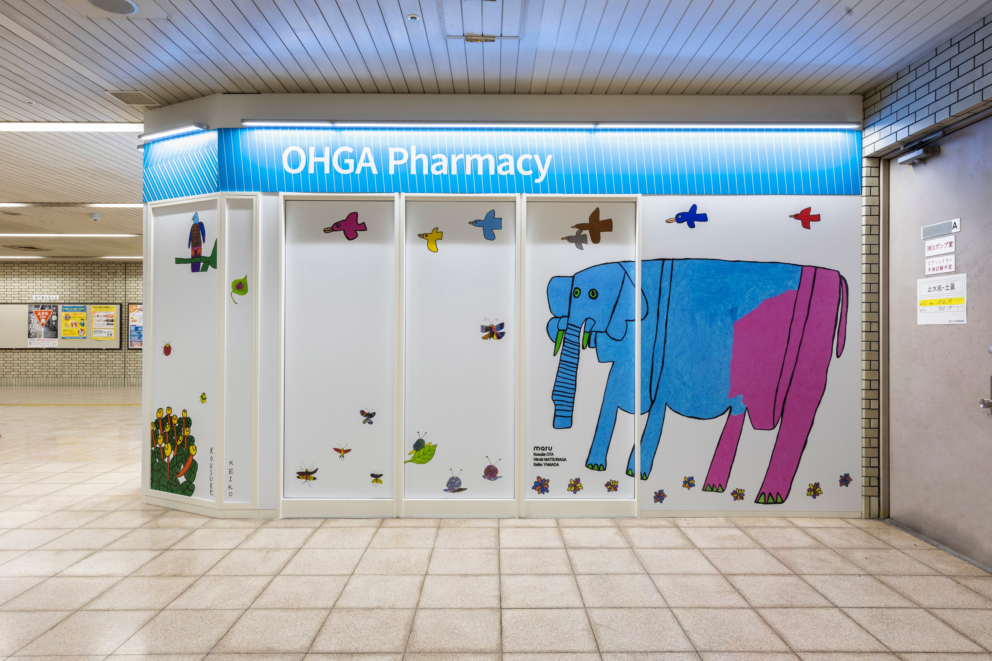 「駅を明るくしたい!通院されている方や通行されている方に元気を届けたい!」との想いから、壁面には、障害福祉サービス事業所『工房まる』(福岡市南区)のアートを起用した。