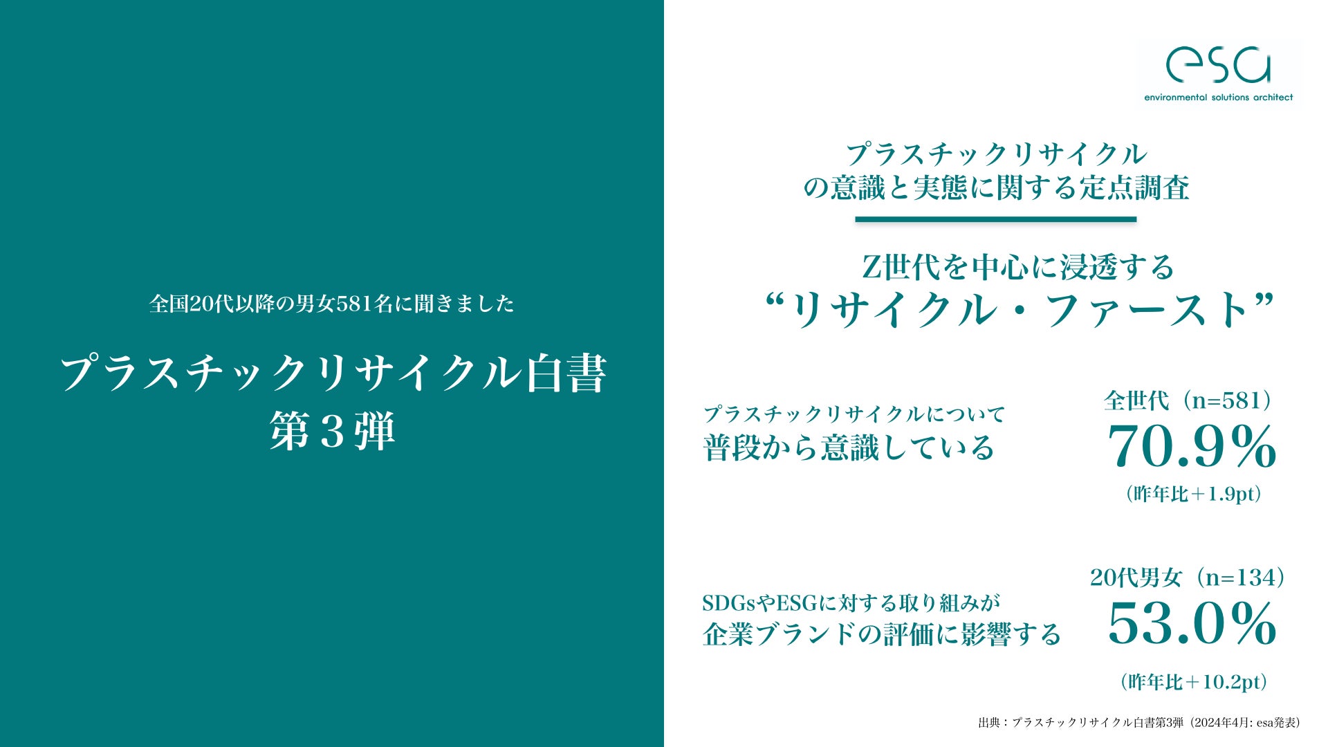 プラスチックのリサイクルを中心とした環境事業を展開する「株式会社esa(読み:イーサ、意味:Environmental Solutions Architect の頭文字)」(本社:東京都港区、代表取締役:黒川 周子、枝吉 宣輝、周 品諺、以下「当社」)は、このたび、生活者や企業のプラスチックリサイクルに関する意識や実態について可視化することを目的に、全国20代〜60代を対象に、「プラスチックリサイクルに関する意識・実態調査」を実施、プラスチックリサイクル白書を発行しました。2023年3月、2023年8月に続きとなり、第3弾となります。