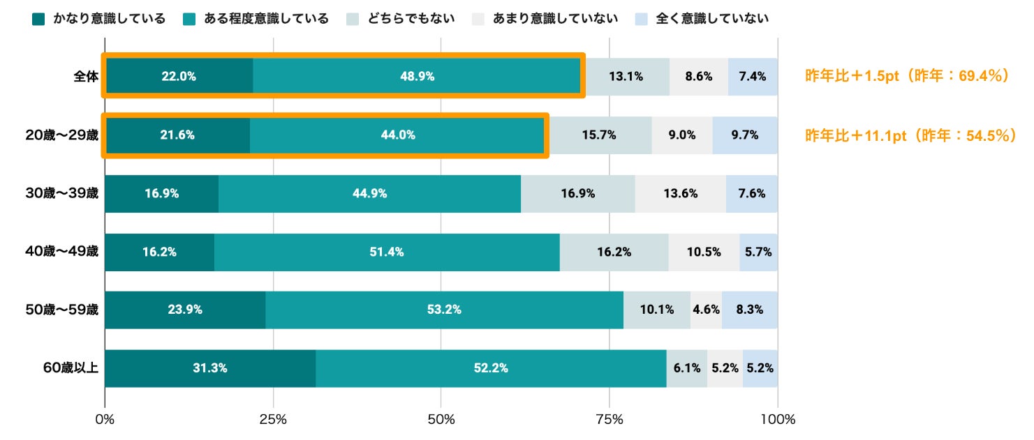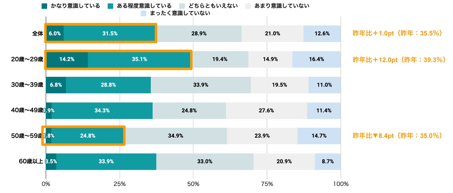 世代別でみると、20代が意識している率がもっとも高く(53.0%)、昨年比+12.9pt高まっています。一方で、50代が24.8%と低い水準となっています。