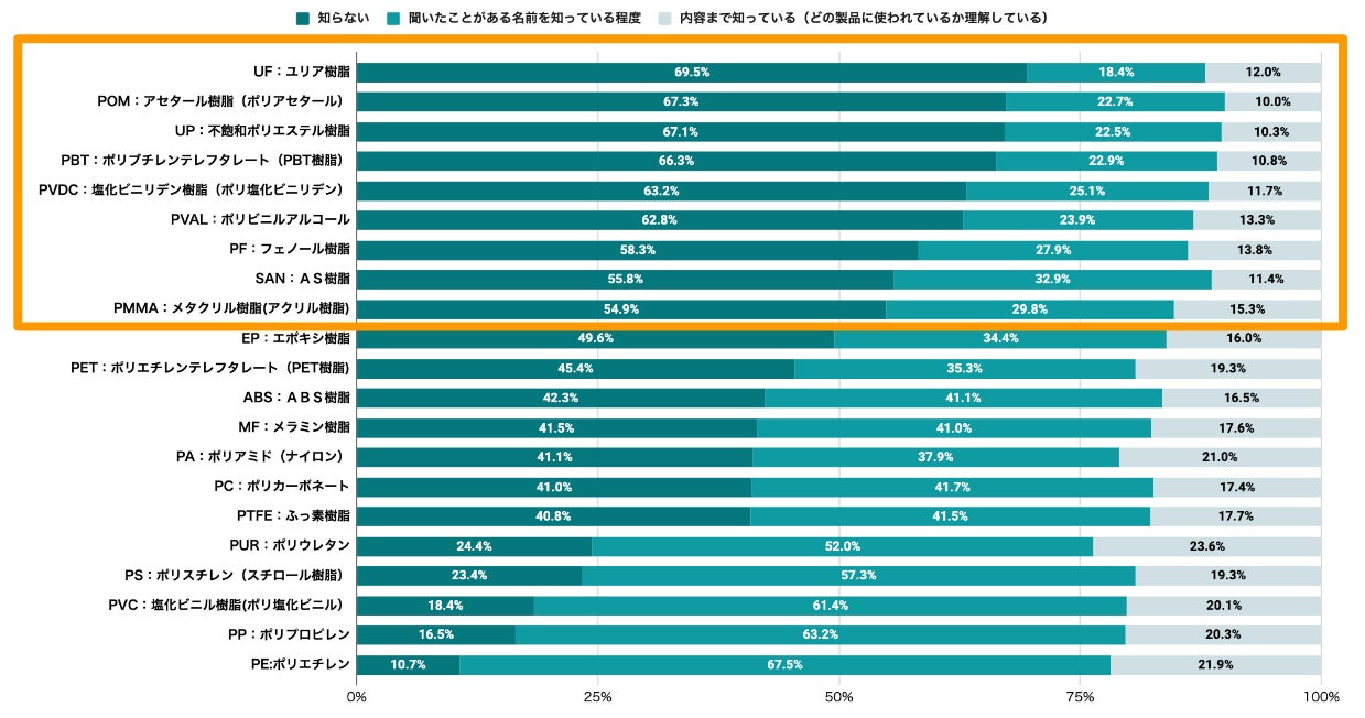 本調査で提示した21種類のプラスチック素材のうち、ほとんどの種類について「どの製品に使われているか理解している」と回答できたのは2割未満にとどまっています。