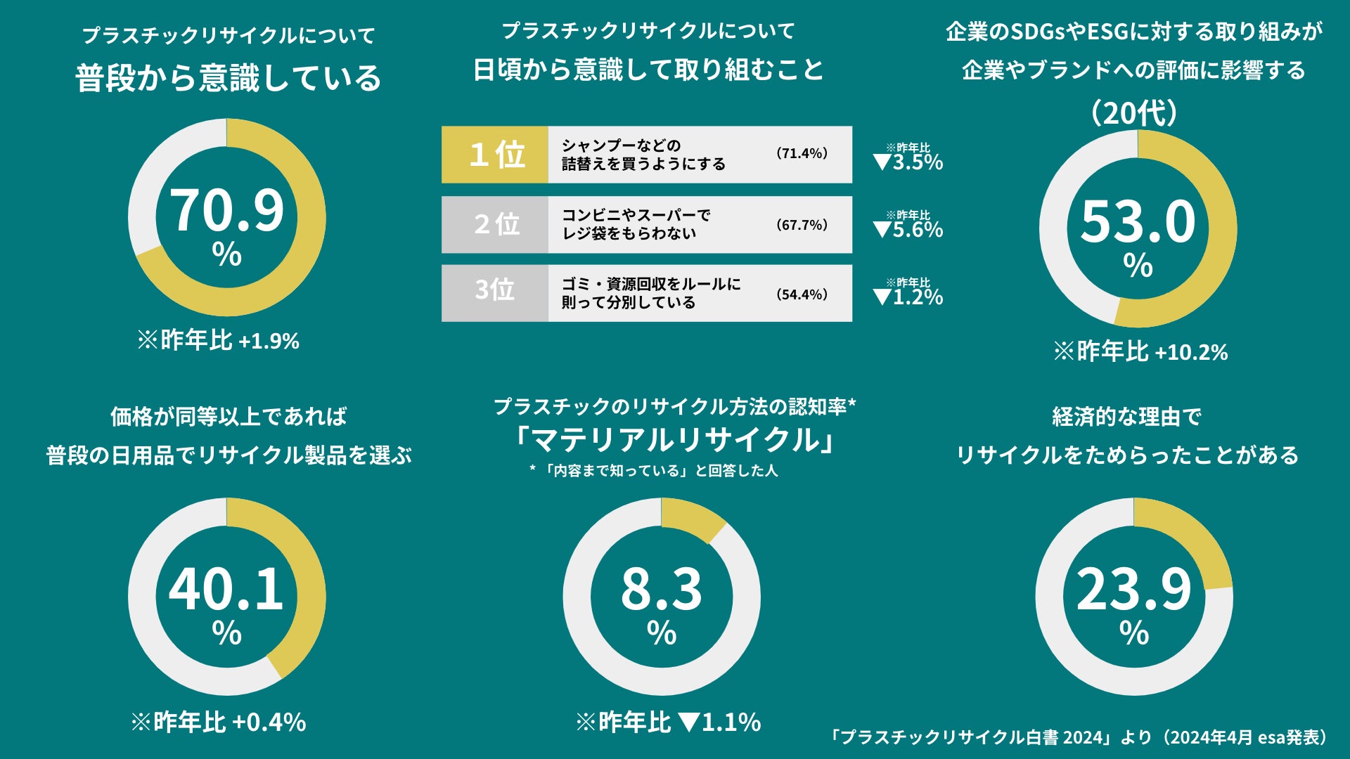 特筆すべきは、20代の間でプラスチックリサイクルに対する意識が昨年より11.1ポイント向上していることです。これは、若い世代が環境問題に対する関心を深め、具体的な行動を起こしている証拠です。しかし、プラスチックに関する知識の理解度は依然として高まっていないという課題が残っています。これは、私たち企業が情報提供と教育の役割を一層強化すべきことを示唆しています。