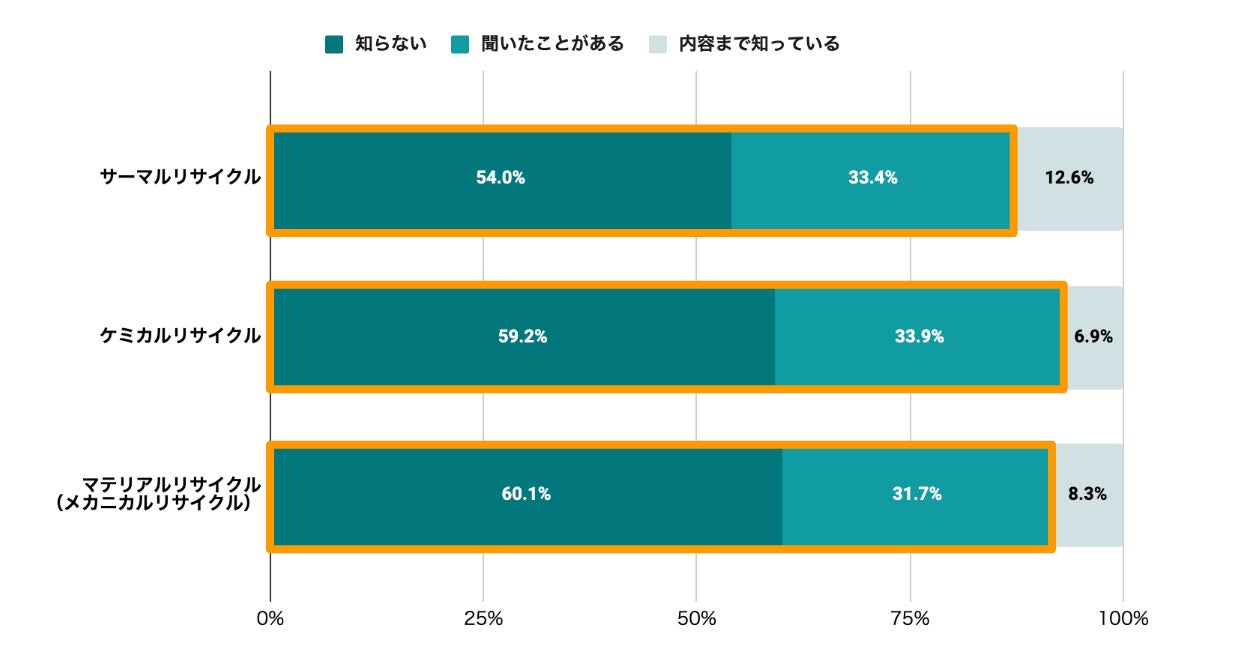 具体的なリサイクル方法(サーマル、ケミカル、マテリアル)について「内容まで知っている」と回答した人は1割程度にとどまっていることから、リサイクルに関する詳細の理解が及んでいないことがわかります。