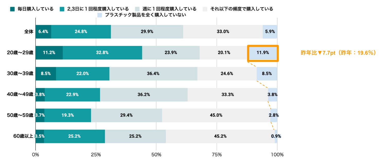 プラスチック製品の購入頻度について、週に1回以上購入している人は全体で約6割程度(61.1%)。一方、プラスチック製品を全く購入していない人は1割未満と回答しています。20代のプラスチック非購入者率は昨年19.6%でしたが、今回は11.9%となっており、プラスチック製品の購入者率は高まっています。