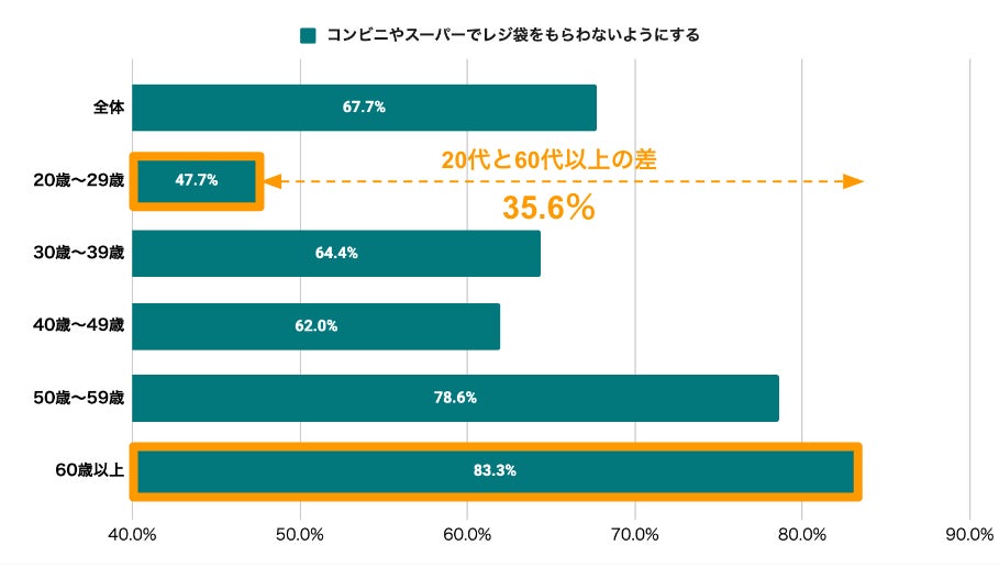 「コンビニやスーパーでレジ袋をもらわないようにする」について、世代別でみていくと、20代は47.7%に対し、60代以上は83.3%と、3割超(35.6%)の差となっています。特に、20代においては昨年から14.6ptも低い結果となっています。