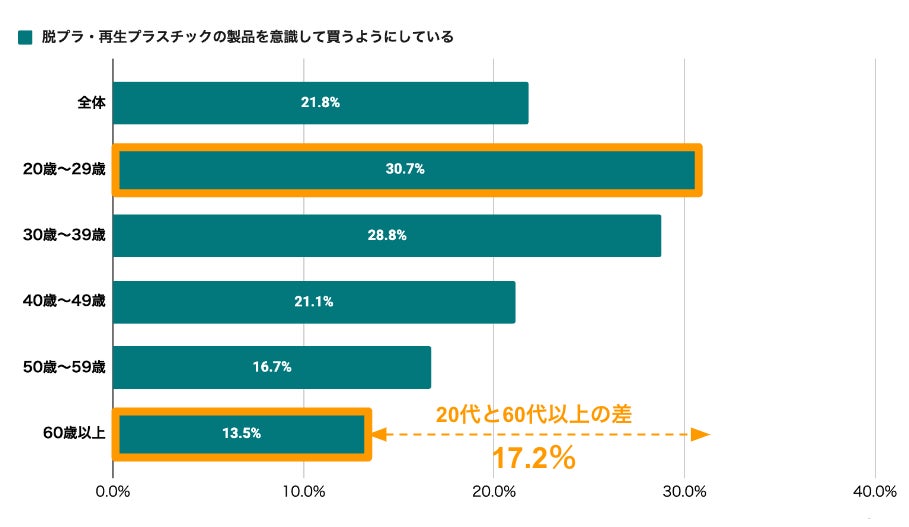 一方で、「脱プラ・再生プラスチックの製品を意識して買うようにしている」という項目では、20代(30.7%)に対し、50代は16.7%、60代以上は13.5%と、20代と30代に比べて1割超の差がつく結果になっています。世代間によって環境・サステナビリティに配慮したアクションが異なることが明らかになっています。
