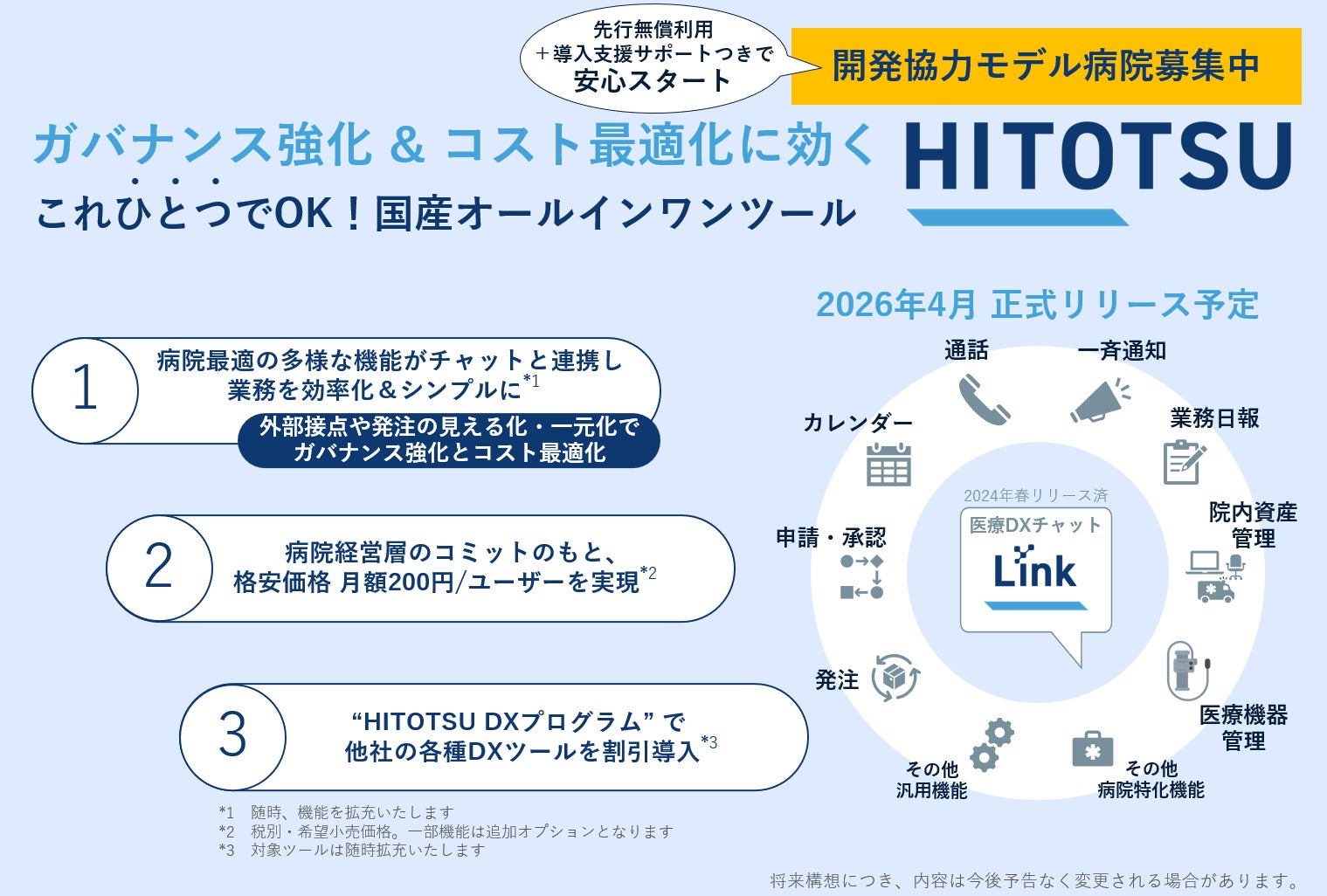 200病院利用の医療DXチャット“Link”がオールインワンツールHITOTSUへ生まれ変わります。モデル病院との無償開発協力が始動