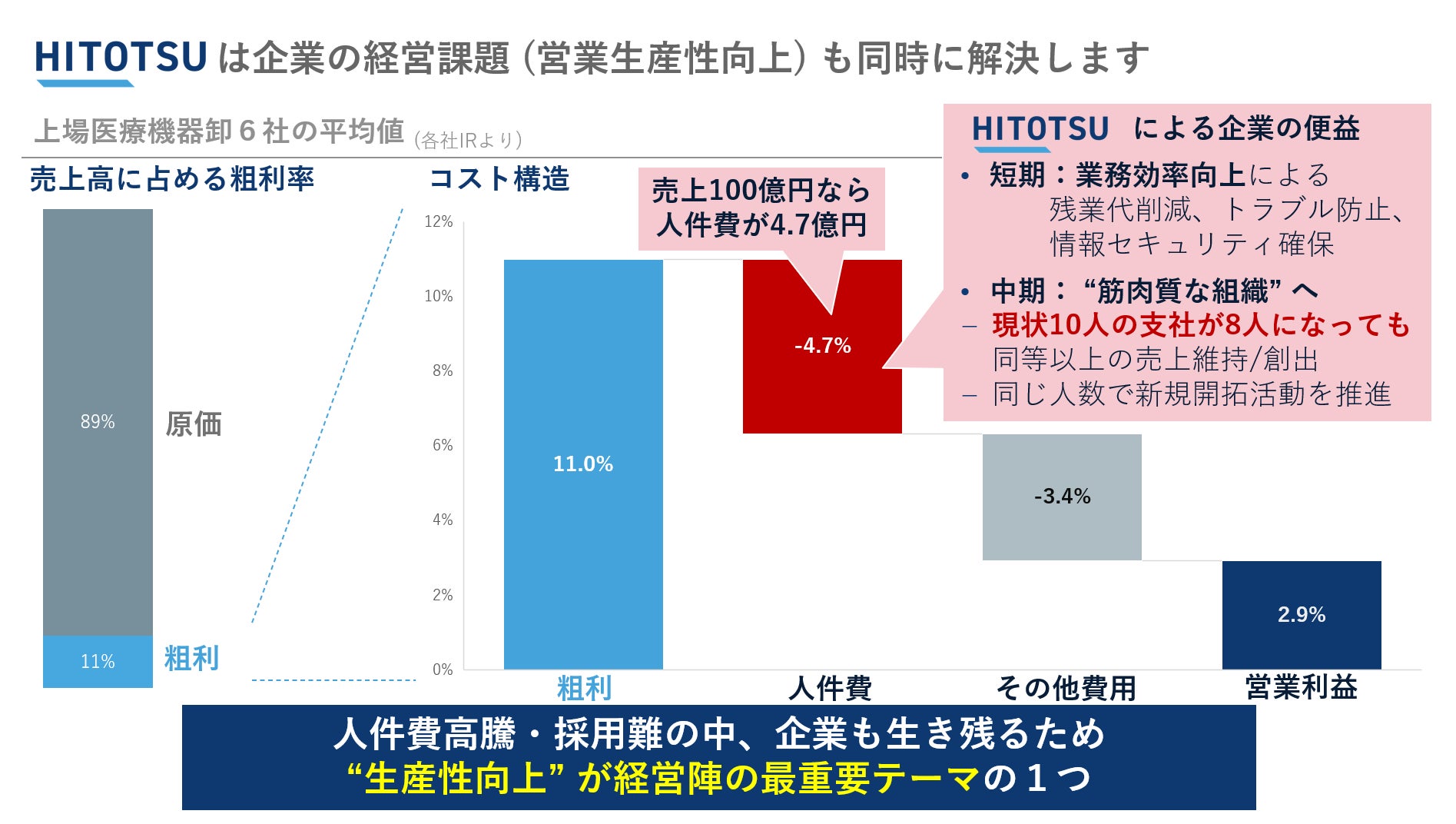 ①病院経営層コミットのもと、医師をはじめとする幅広い部署・職種で企業様と一緒にLink/HITOTSUをご利用いただき、業務効率化などの有用性を実感していただく