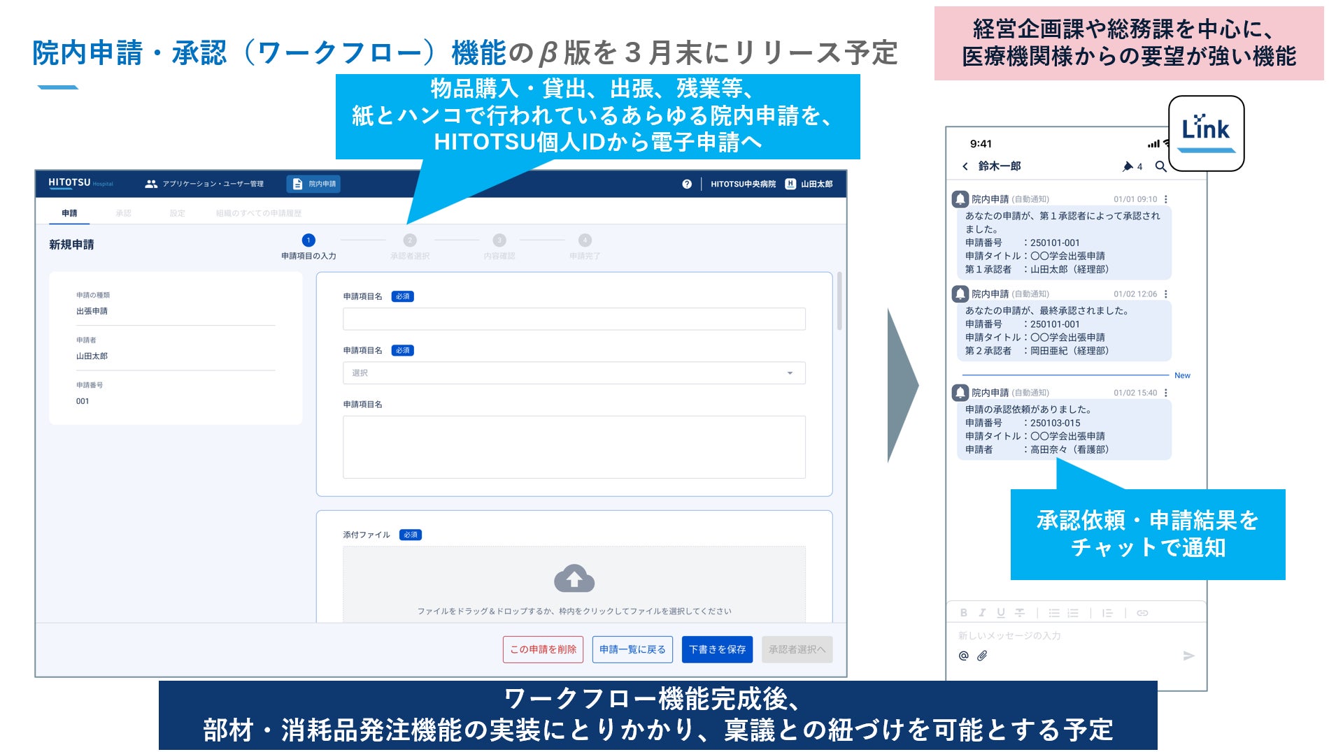 “HITOTSU”には、申請・承認(ワークフロー)や発注、カレンダー、通話など、病院業務に最適化された多様な機能が搭載され、それらが通知連携をはじめLinkで相互につながります。そして、病院の経済的負担を最小限に抑えるため、業界全体の生産性向上に対する経営層のコミットメントの下、格安価格(月額200円/ユーザー)で提供します。2026年4月に正式リリースを予定しております。