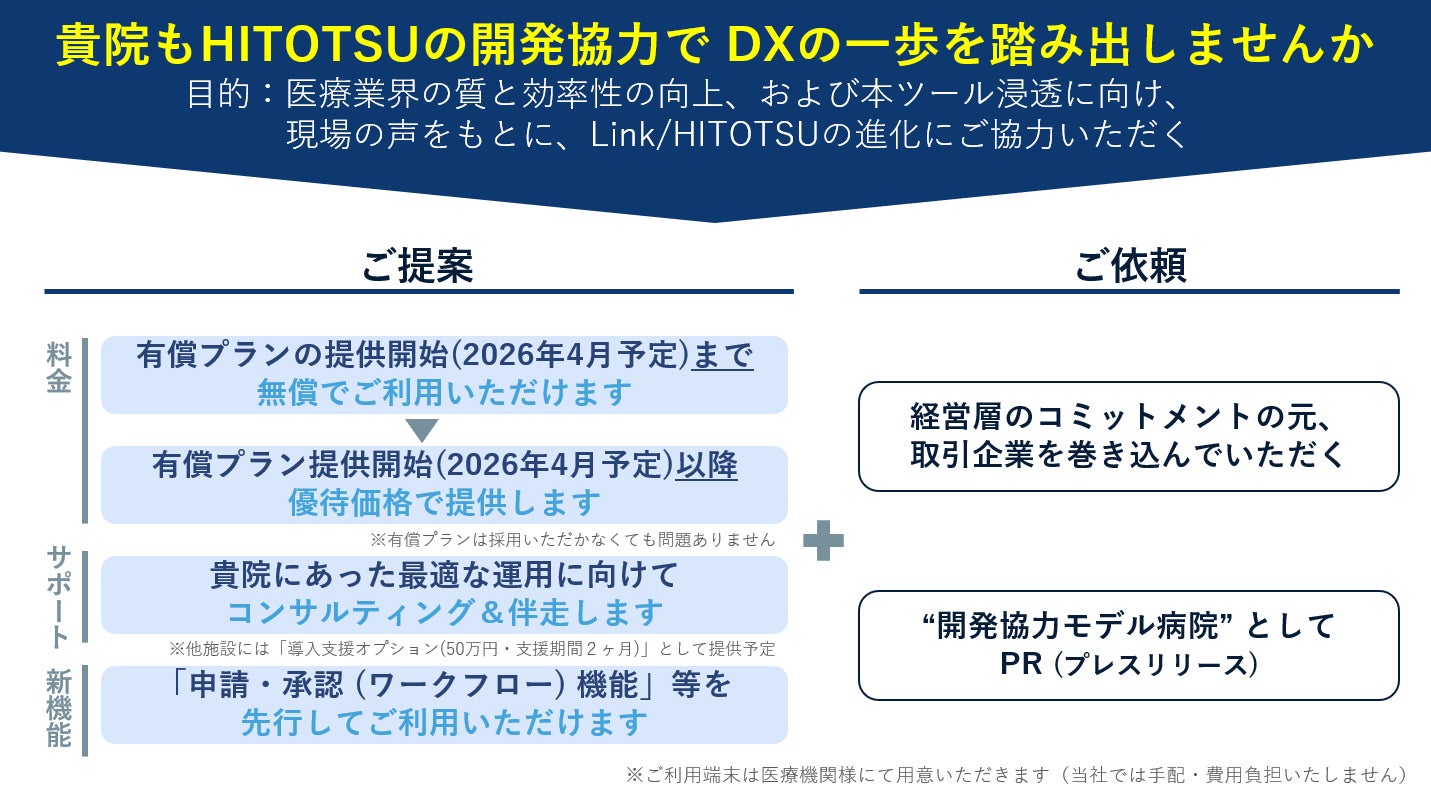 現在、当社では、オールインワンツール“HITOTSU”の開発協力モデル病院を数施設限定で募集しています。上記の通り、有償提供プランの提供開始(2026年4月予定)まで全従業員様 無償でご利用いただけるほか、有償プラン提供開始以降も優待価格で提供します。本開発協力においては、回生病院様のように、病院の経営層にコミットいただいたうえで病院全体でのご協力が必須です。導入に当たっては数部署でのパイロット運用から始め、取引企業含め徐々に利用者を増やす形で無理なく進めます。