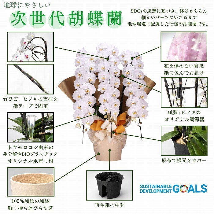 鉢はもちろん、細かいパーツにいたるまで徹底的に環境に配慮した仕様の胡蝶蘭