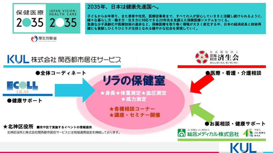 株式会社関西都市居住サービス(本社:大阪市中央区、代表取締役中瀬 弘実)は、「エコール・リラ(神戸市北区)」ショッピングセンター内に地域の皆様が自由に身長・体重・血圧測定など自身の健康管理に利用でき、また、関係機関連携の下、健康に関する心配事などについて専門家に気軽に相談できる「リラの保健室」を2024年4月2日に設置しました。