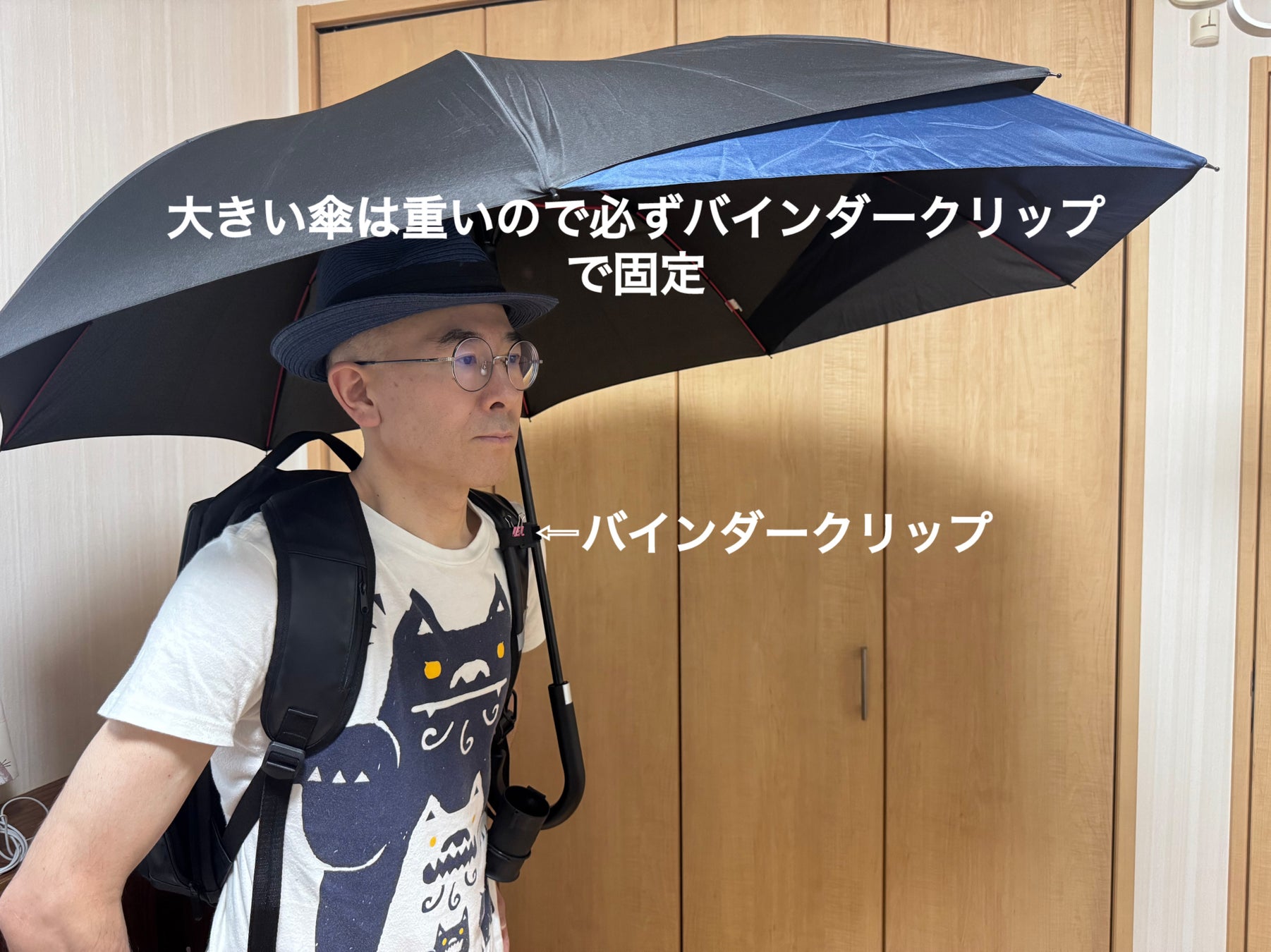 新しいアタッチメントにより、大きな傘を使用することも可能です。伸びる傘や16本骨傘、大きい折り畳み傘なども利用可能。大きい長傘は重いので、介護で使う場合はバインダークリップでアタッチメント固定します(お辞儀運動をするとアタッチメントのベルクロが重さで負けてしまい傘が外れます。)