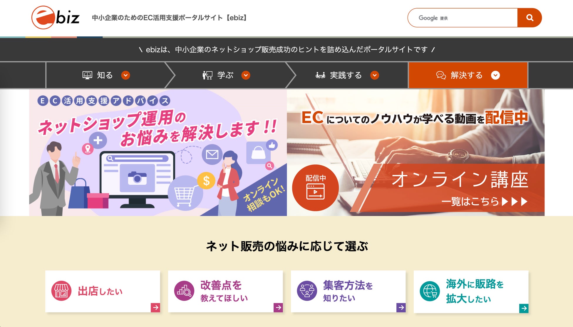 ebizは、独立行政法人 中小企業基盤整備機構(略称:中小機構)が運営する、中小企業のネットショップ販売成功のヒントを詰め込んだポータルサイトです。