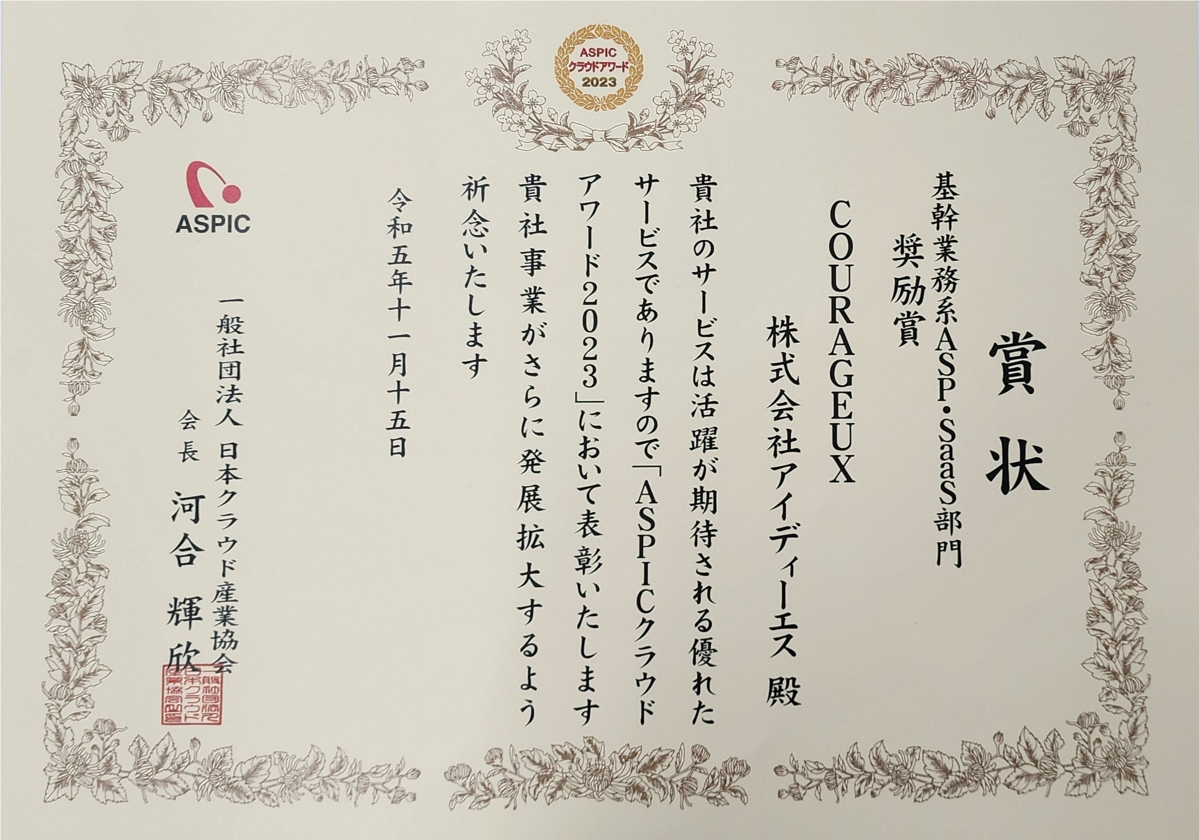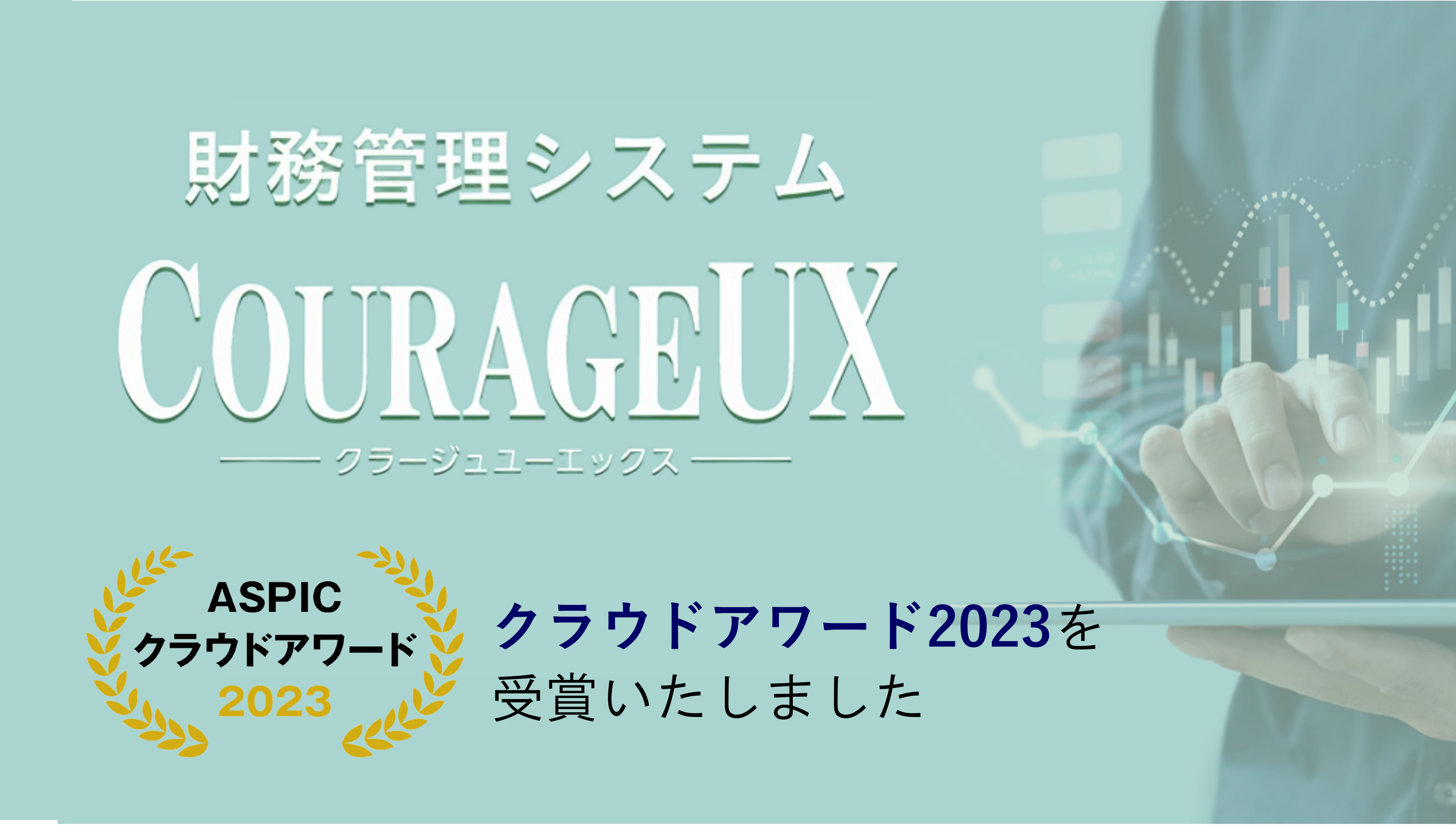 る財務管理システム(借⼊⾦管理・貸付⾦管理)COURAGEUXは、一般社団法人日本クラウド産業協会(ASPIC)が主催し、総務省などが後援する「第17回ASPICクラウドアワード2023」の「基幹業務系ASP・SaaS部門」にて、「奨励賞」を受賞致しました。