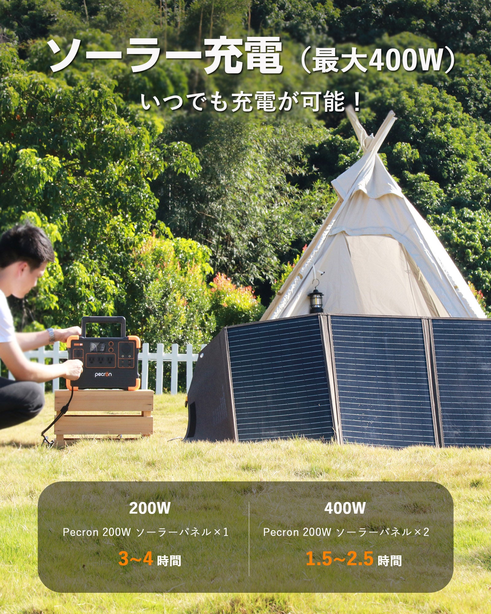 「Pecron E600LFP」ポータブル電源は、弊社の充電技術「UBSF」を採用しているため、急速充電を実現できました、充電スピードと安全性のバランスを最大限効率化しました。ACアダプターにて2.2時間でフル充電が可能です。MPPTを採用して、2枚のPecron 200Wソーラーパネルにて約1.5-2.5時間でフル充電可能です。シガーソケット充電の場合、約7時間でフル充電が可能です。