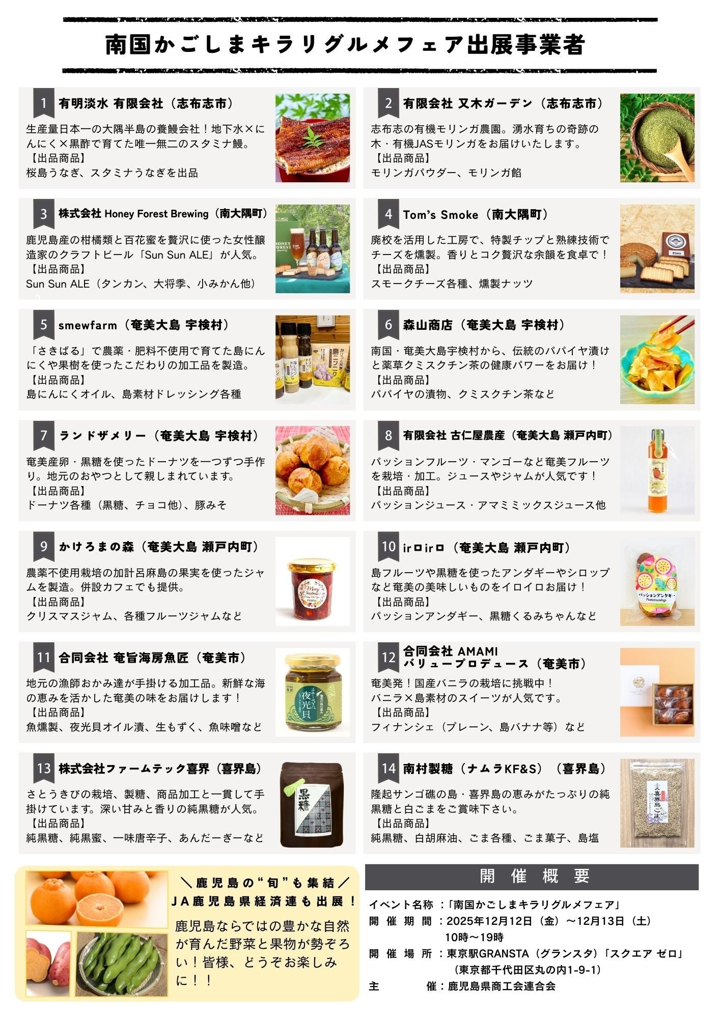 鹿児島県商工会連合会(住所:鹿児島県鹿児島市、会長:森 義久)は、東京駅GRANSTA(グランスタ)「スクエア ゼロ」にて、2025年12月12日(金)・13日(土)の2日間、鹿児島県の“食”をテーマにした物産イベント「南国かごしま キラリグルメフェア」を初開催いたします。
