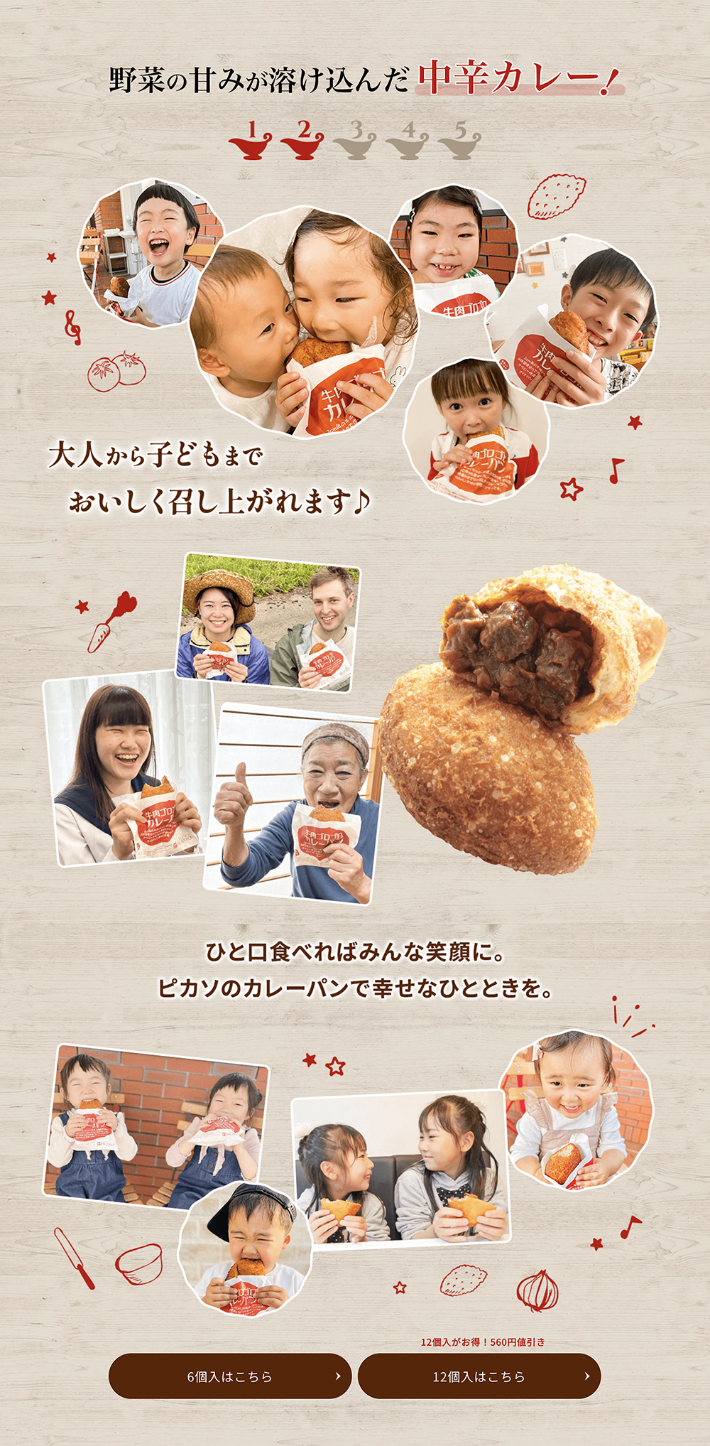 お客様から「カレーパンのカレーがどのくらい辛いのか分からない」というご意見をいただき「子どもから大人までおいしく召し上がることができる辛さ」を表現するために、カレーの辛さを表す辛さレベルと、カレーパンを召し上がっているお子さまやご家族の写真を追加したデザインに変更しました。