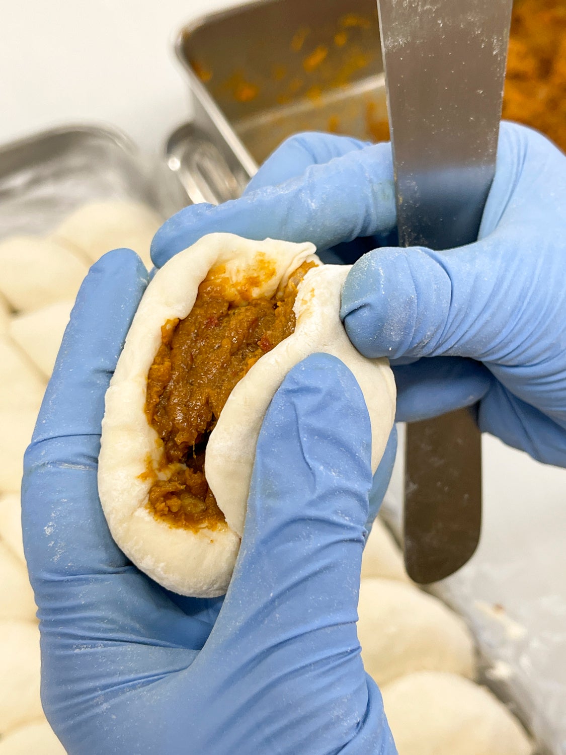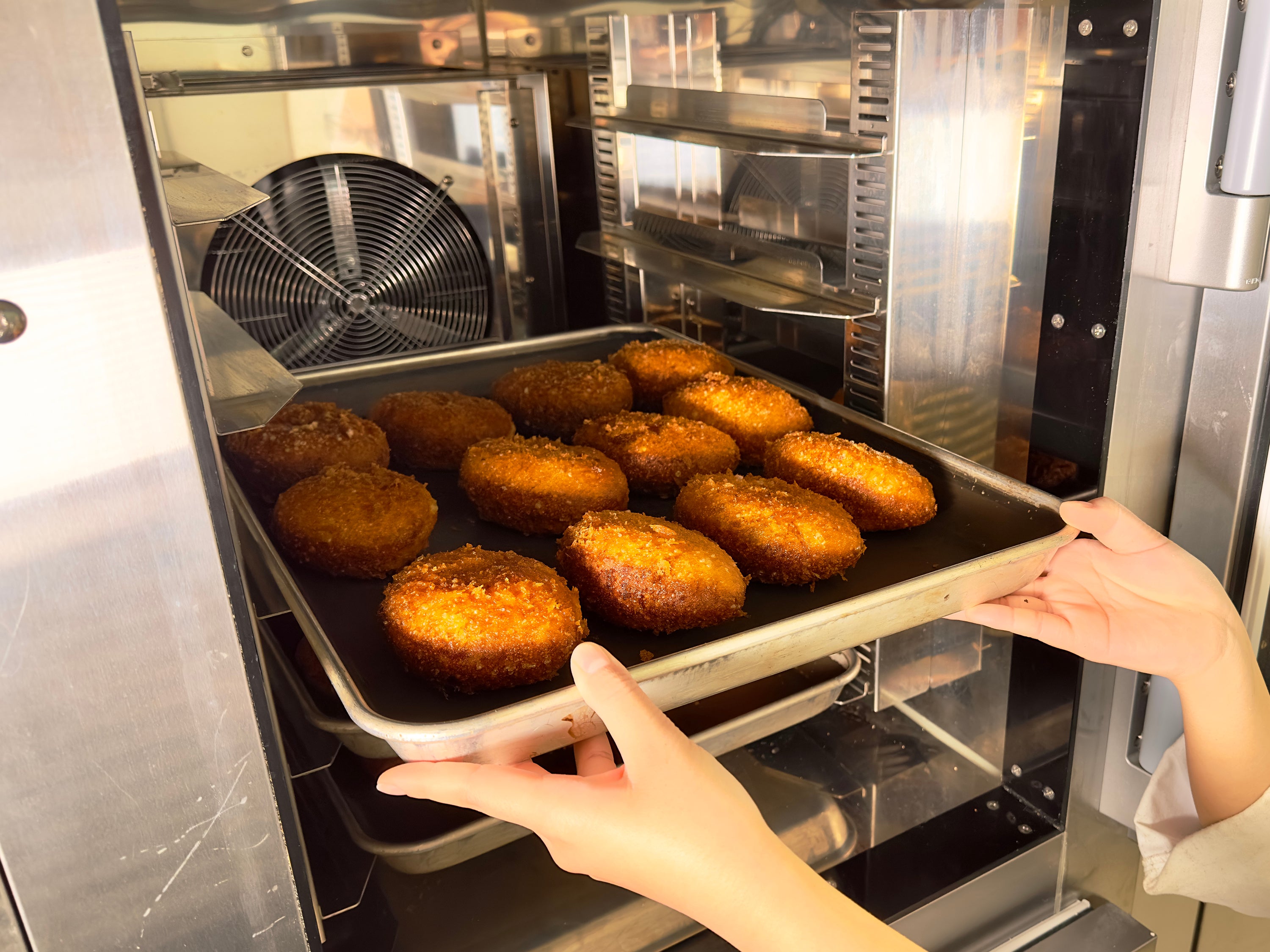 まだ湯気が出ている揚げたての状態をブラストチラーで急速冷凍し、おいしさを閉じ込めた冷凍カレーパンを全国へお届けします。通常、焼き上げたパンからは湯気としておいしさ・香り・水分が抜けてしまいます。 ブラストチラーで湯気ごと急速冷凍することで、食材の旨味・香り・水分などをギュッと閉じ込め、再加熱してもおいしく召し上がっていただける状態に仕上がります。