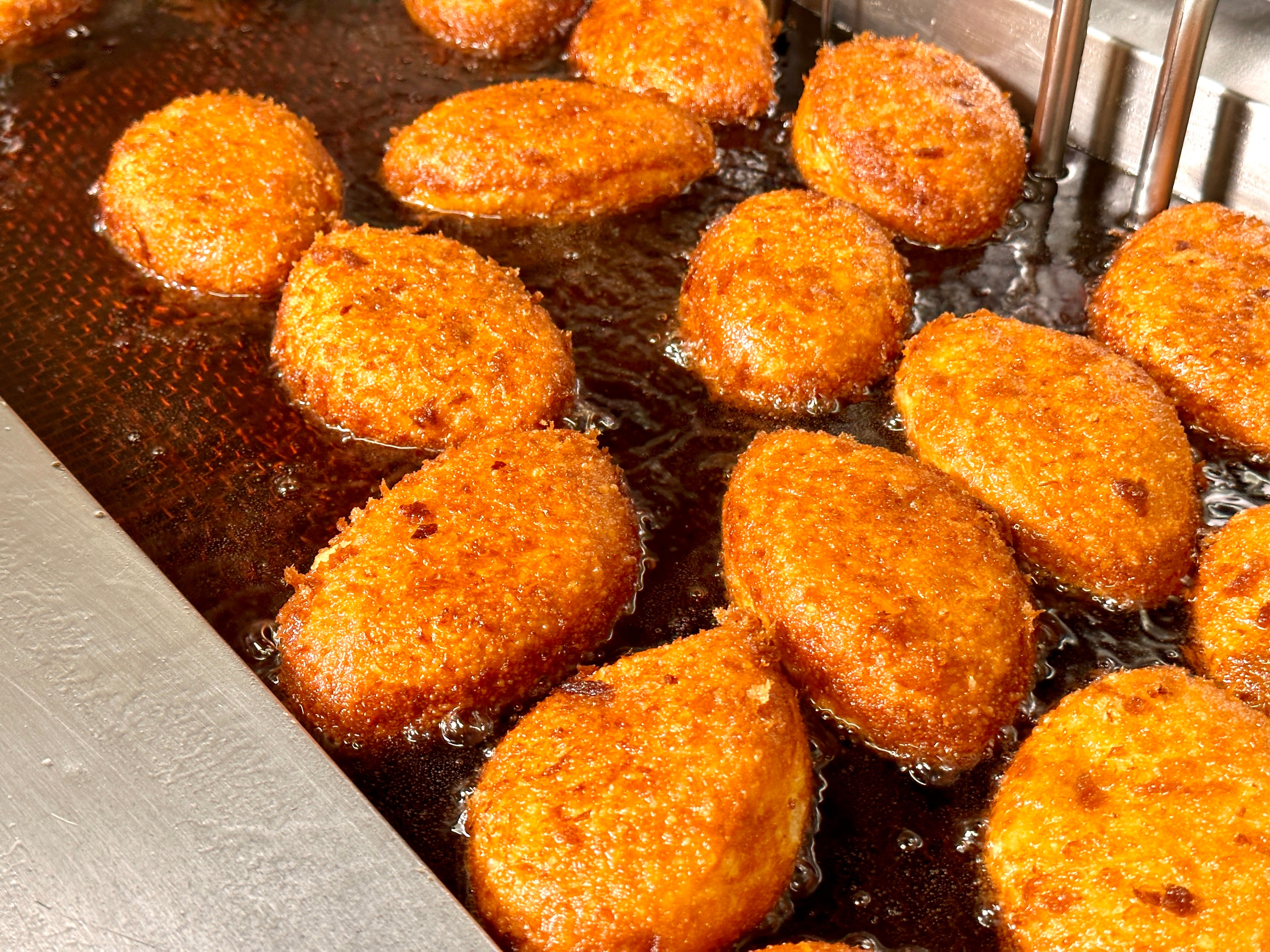 たっぷりのカレーを少量の生地で包み、薄皮生地の食感を大切にしています。180℃の油で片面2分ずつ揚げて、ひと口食べたらクセになる、カリッと食感に仕上げました。風味豊かな自家製生パン粉のサクッと食感も絶品です。
