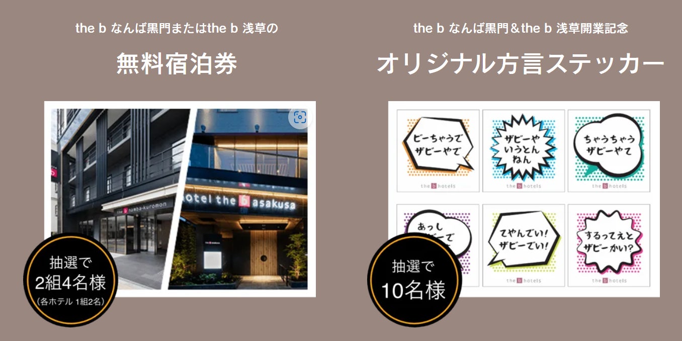 Twitterでは「こっちの方が食うてみたいな!」と思う方に投票するキャンペーンをやっとります。題して東西B級グルメ対決フォロー&リツイートキャンペーンですわ。投票してくれはったら、the b なんば黒門かthe b 浅草に泊まれる無料宿泊券(抽選で2組4名様)か、the b hotelsオリジナル方言ステッカー(抽選で10名様)をプレゼントさせてもらいまっせ。ぜひ楽しんでみてや!